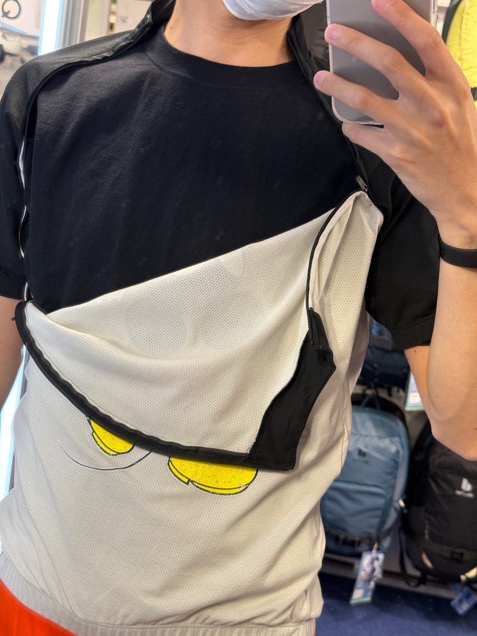 こちらのジャージ最大の特徴が サイドスプリットファスナーになっています。右はハーフジップ、左はフルジップのダブルファスナーになっています。暑すぎる時は3枚目の写真の様に前側を大きく開ける事ができます。これは面白い!