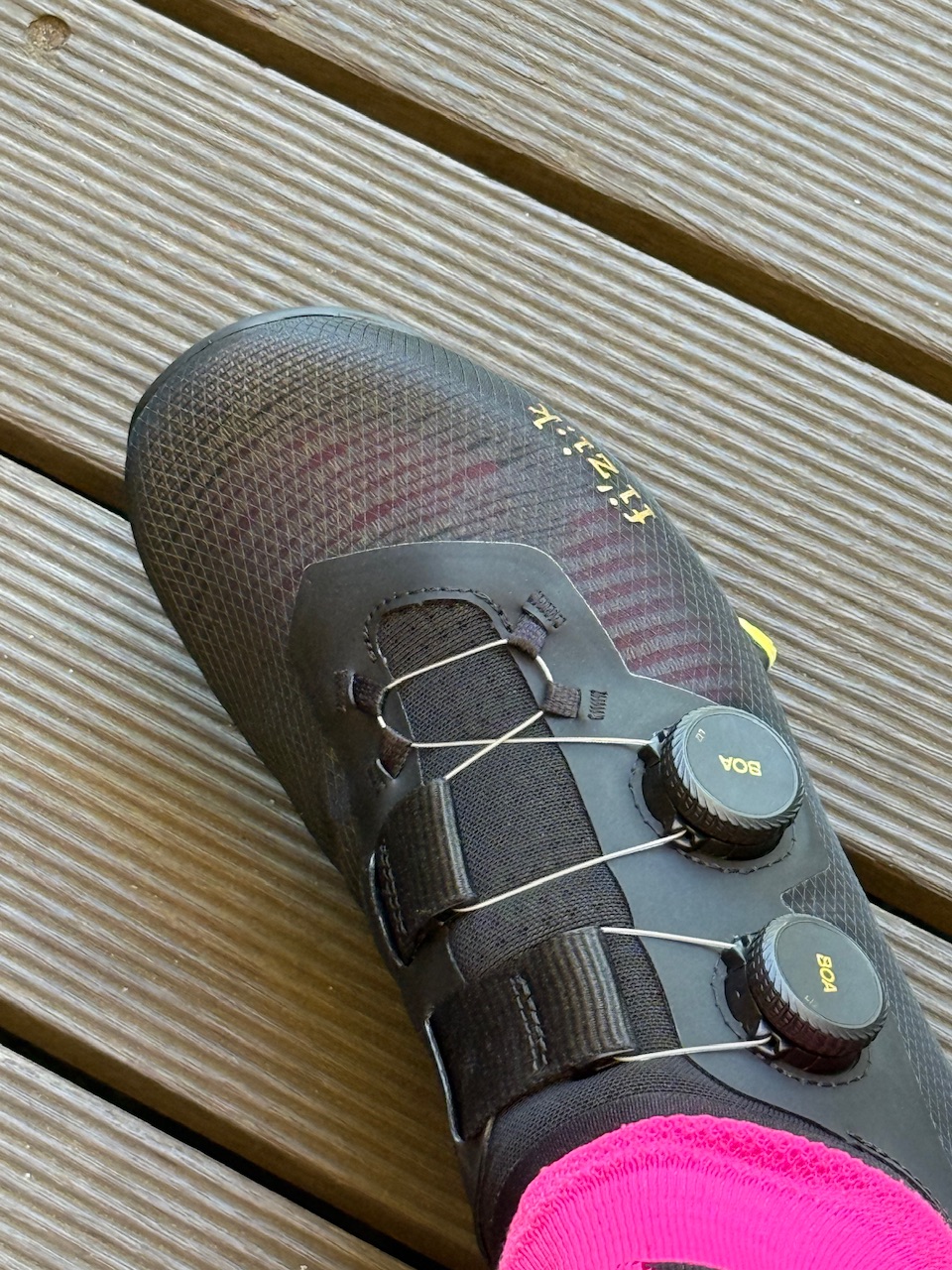 私の足は細く元々fi’zi:kのシューズは相性が良かったのですが、VENTO VEGA CARBONは別物でした。履き口はソックスのように伸ばして履くという他のfi’zi:kシューズには無い独特なものになっています。これが個人的にすごく良くて、足首の動きに追従する感覚が気持ちいいです。ヒールカップは深く、上部のクッションがしっかり押さえ込んでくれるので手で包まれている様な感覚です。ダイヤルの締め付けをしなくても良いぐらい足に密着しますが、締めると内側のベルトが引きあがりさらに足を固定します。トゥーボックスは今の流行りっぽく広くなっています。指のストレスは一切ありませんでした。