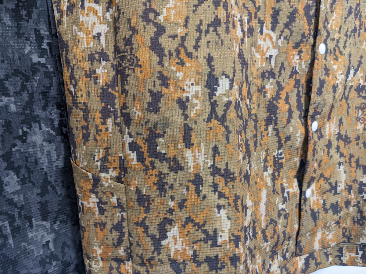 narifuriオリジナルのプリントを使用した開襟シャツ。個人的に開襟シャツといえばキューバシャツというイメージですが総柄も悪くないですね。総柄が多いアロハとはまた違った趣があって素敵です。デジカモというアーバンなプリントが魅力です。都会的にきれいに羽織るならブラックを、開放感あるイメージならベージュがおすすめ。あるいはどちらも。