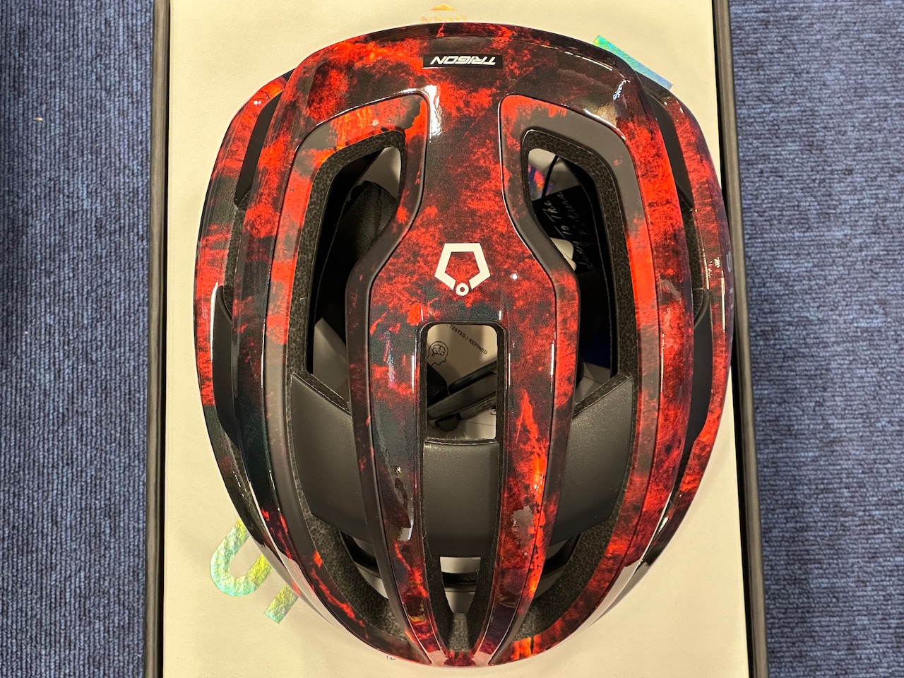 チーム供給モデルなので頭頂部や側頭部後側などにチームのロゴやチーム名などがプリントされておりますが、それよりも赤い溶岩の方が目立つ熱いカラーリングとなっておりますw