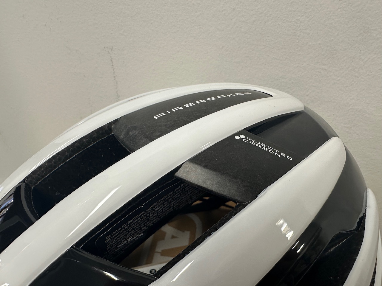頭頂部のカーボンブレードによりヘルメットの剛性を高めております。INJECTED CARBONの文字が印字されている部分です。