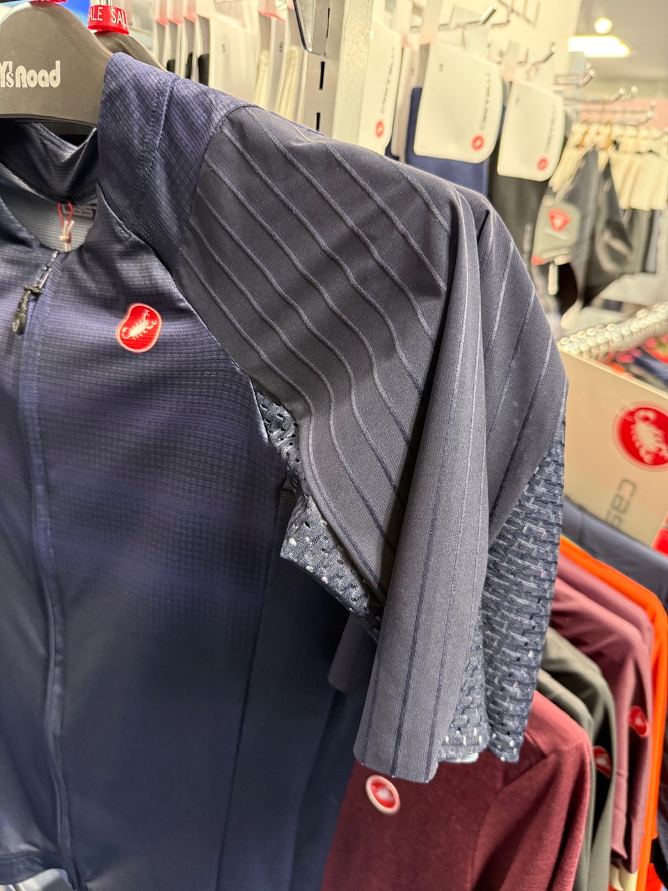 最近は自転車だけではなく、ウェアもエアロを意識した商品が増えています。少しでも楽に速くを求める方におすすめなジャージです。肩周りの空気の流れを最適化するエアフローショルダー構造が空気抵抗を従来モデルよりも6%削減します。(6%削減 = 時速40kmの速度帯だと40.8kmを計測する計算になります)