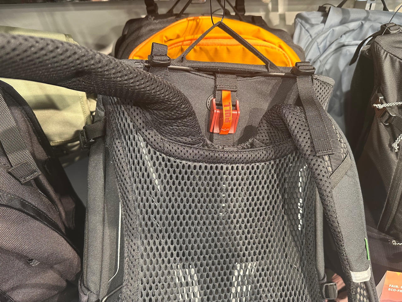 ヘルメットホルダーはバッグのループにヘルメットの顎紐を通す仕様。その他、背中にはライトアタッチメントとしてクリップライトが取り付けできるループがついております。