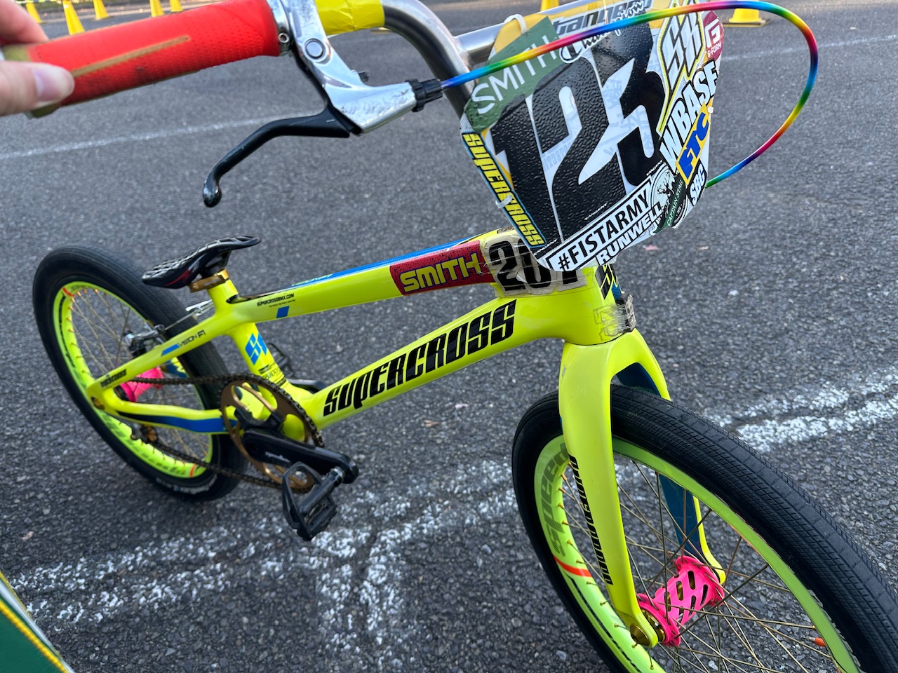 こちらが会場で目に止まった菊池選手のレースマシンでございます。わざわざブースの外に出してもらいました。ド派手な色だけじゃなく、ハブの肉抜き加工だったり、ふんだんに使用されたチタンパーツだったり、ロードレース用のSPD-SLペダルだったりと、菊池選手のこだわりの詰まった1台で、大変眼福でございました。これからも応援しております!
