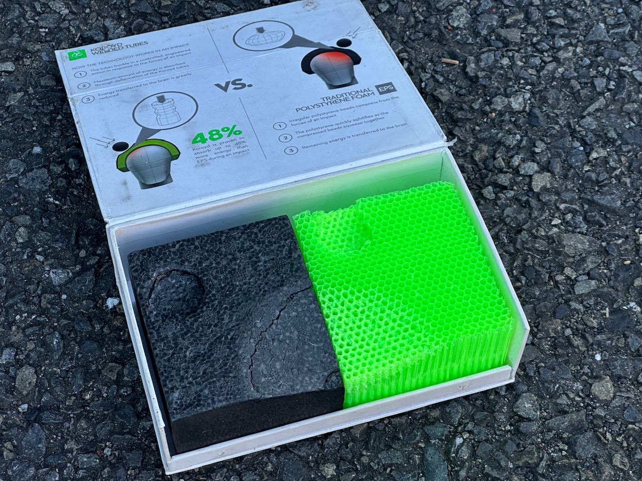 横から見ると分かりやすく、衝撃を受けた時に素材がこのように潰れたり割れたりすることで衝撃のエネルギーを吸収します。こうして並べてみるとKOROYDの方がまだ余力を残しているように見えます。そして実際このサンプルほどの衝撃を頭に受ける状況となれば、身体の方にも影響が出そうです。あくまでサンプルということで。