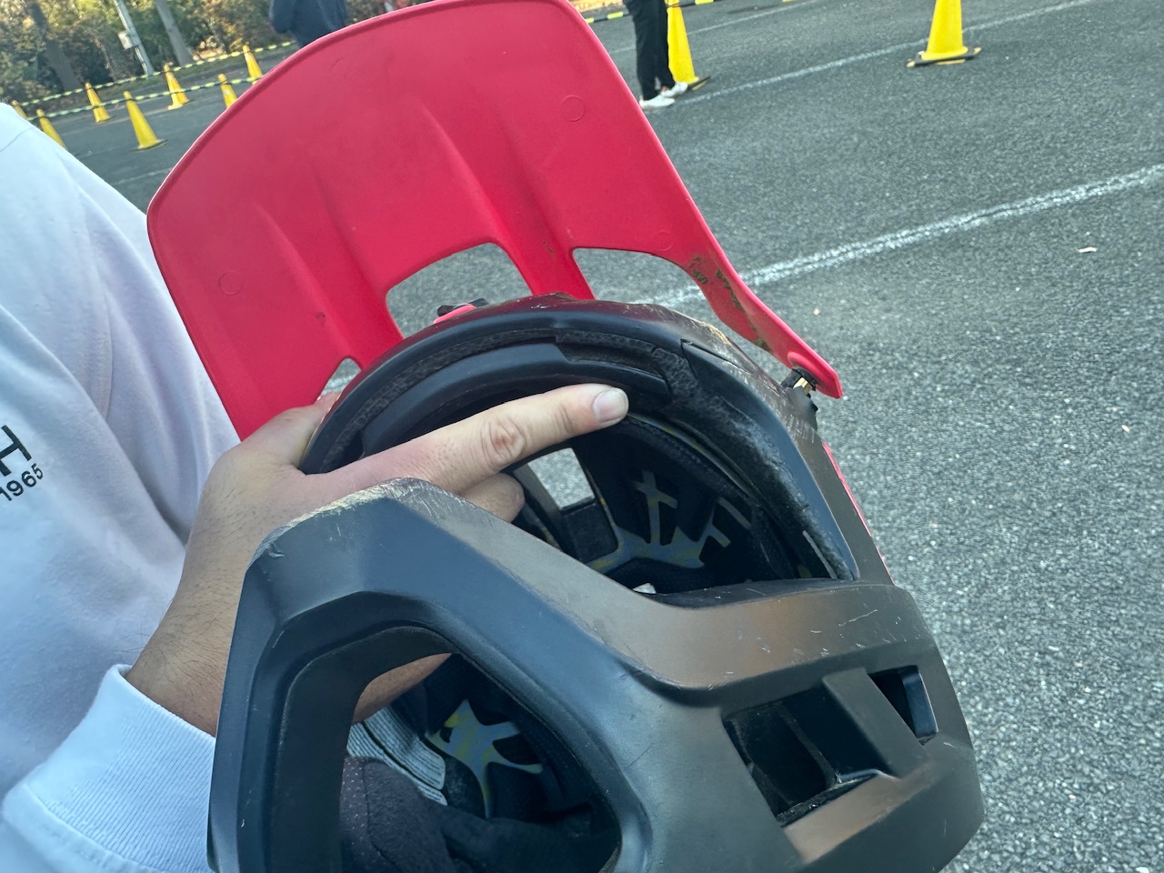ヘルメットは衝撃を受けると、ヘルメットを構成する素材が潰れたり割れたりすることで衝撃のエネルギーを吸収します。フルフェイスヘルメットをよく見せていただくと、内側はひび割れ、バイザーはもげております。少し力を加えると軋みもあり、内側の見えないどこかが損傷を受けていることが感じられました。