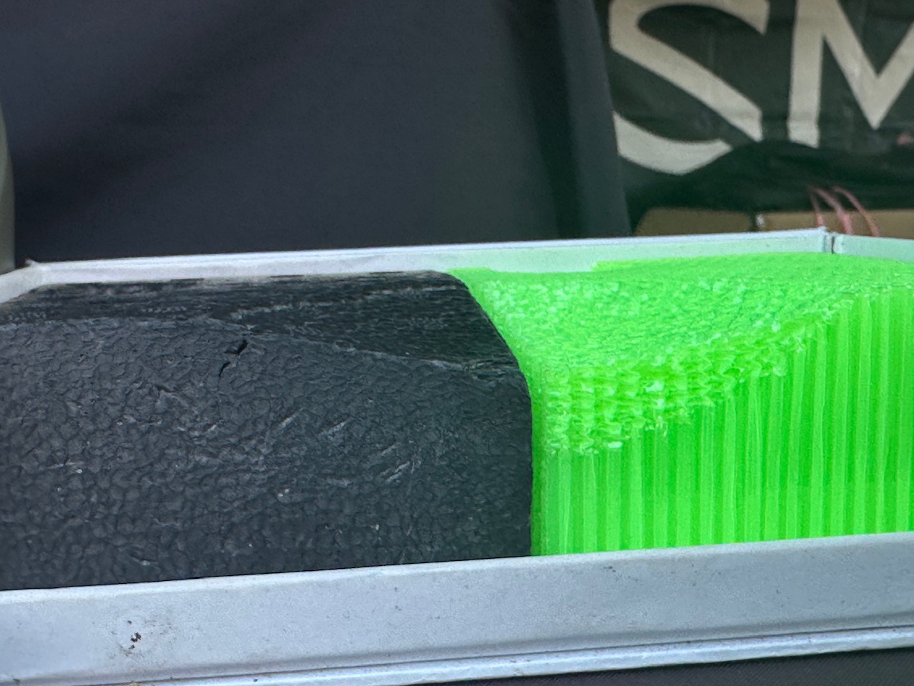 この右側の部分がKOROYD、左側はEPS(発泡スチロール)です。手前中央は結構な衝撃が加えられたであろう凹み方をしております。また奥の丸い小さな凹みは、ハンマーで叩いた跡でしょうか?こちらもかなり強く叩いたような感じです。