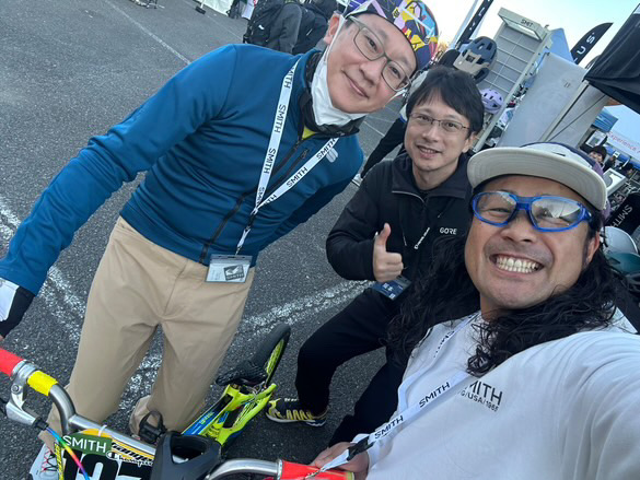 ヘルメットやシューズを見つつ、ふと目に止まったのは、SMITHブースにBMXレーサーのプロ選手、菊池雄選手がいらっしゃいました!翌日のスポーツバイクデモにも参加していただいたそうなので、お会いしたお客様もいらっしゃるかと思います。後ろには実際使っている車体が展示されており、ヘルメットも一緒に見せてもらったのですが。。。。