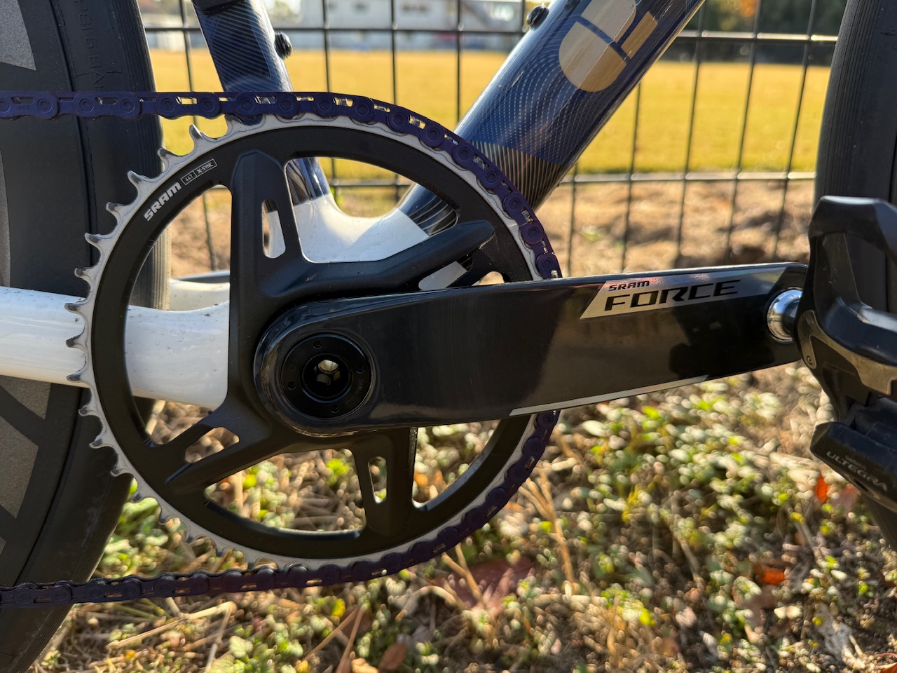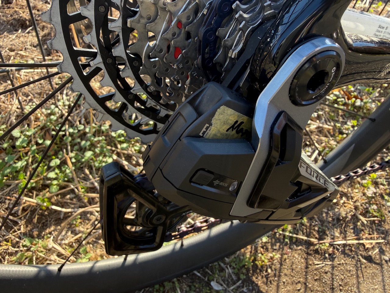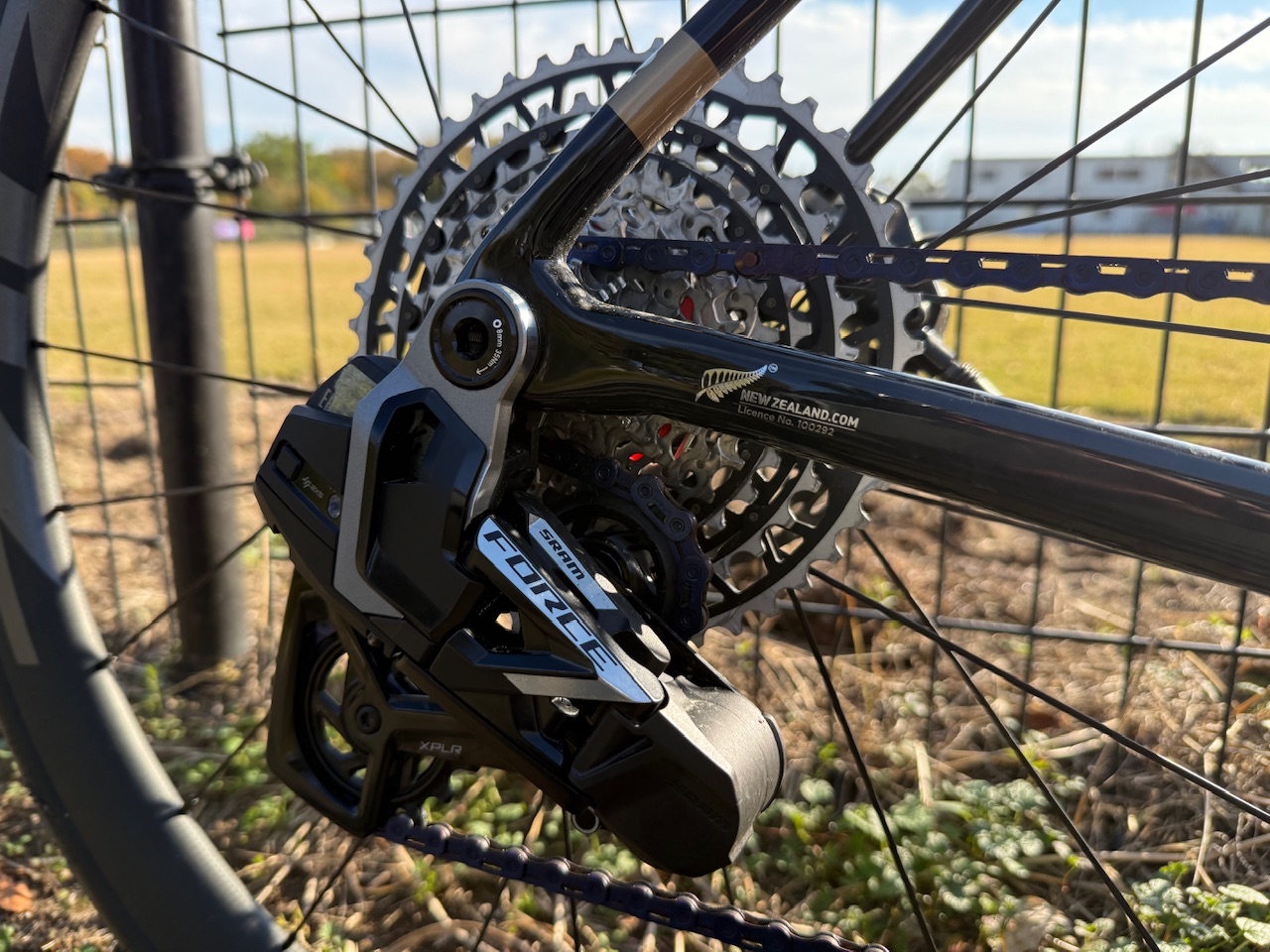 こちらも試乗が可能だったので試させていただきました。今年の6月にフルモデルチェンジとなったForce XPLR AXS。1×13のグラベルコンポーネントではありますが、最近ロードでも採用が増えている組み合わせになります。カセットスプロケットは13速の10-46Tと超ワイドとなっています。フロントの歯数を調整することで用途に合わせることができます。