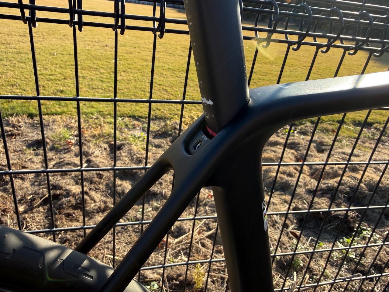 トップチューブから伸びる細すぎるシートステーが美しいです。ドロップシートステーが増える中、差別化もできて最高です。