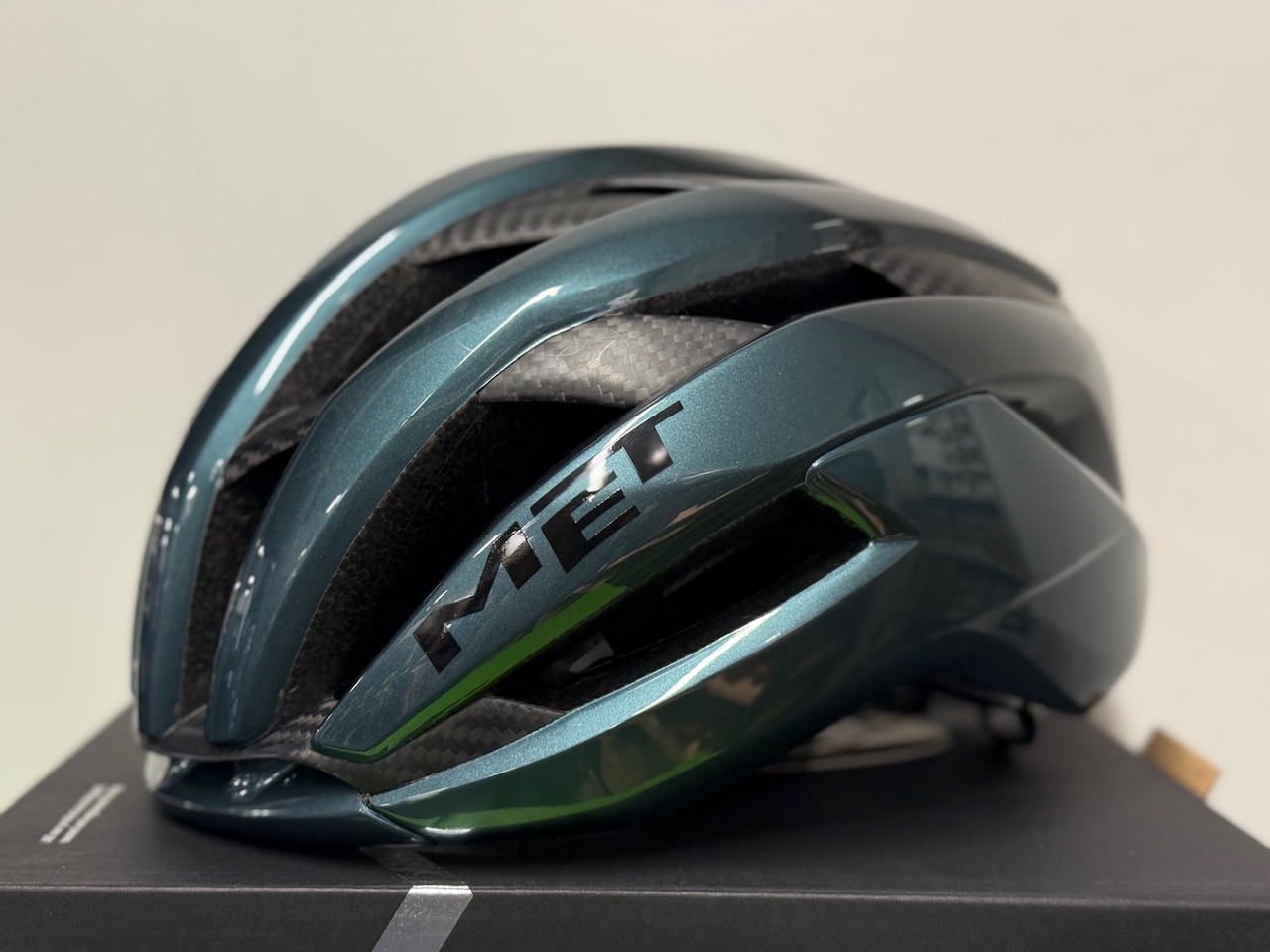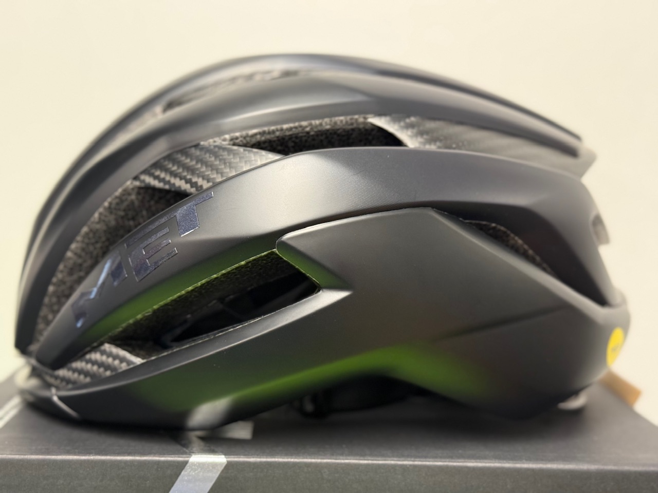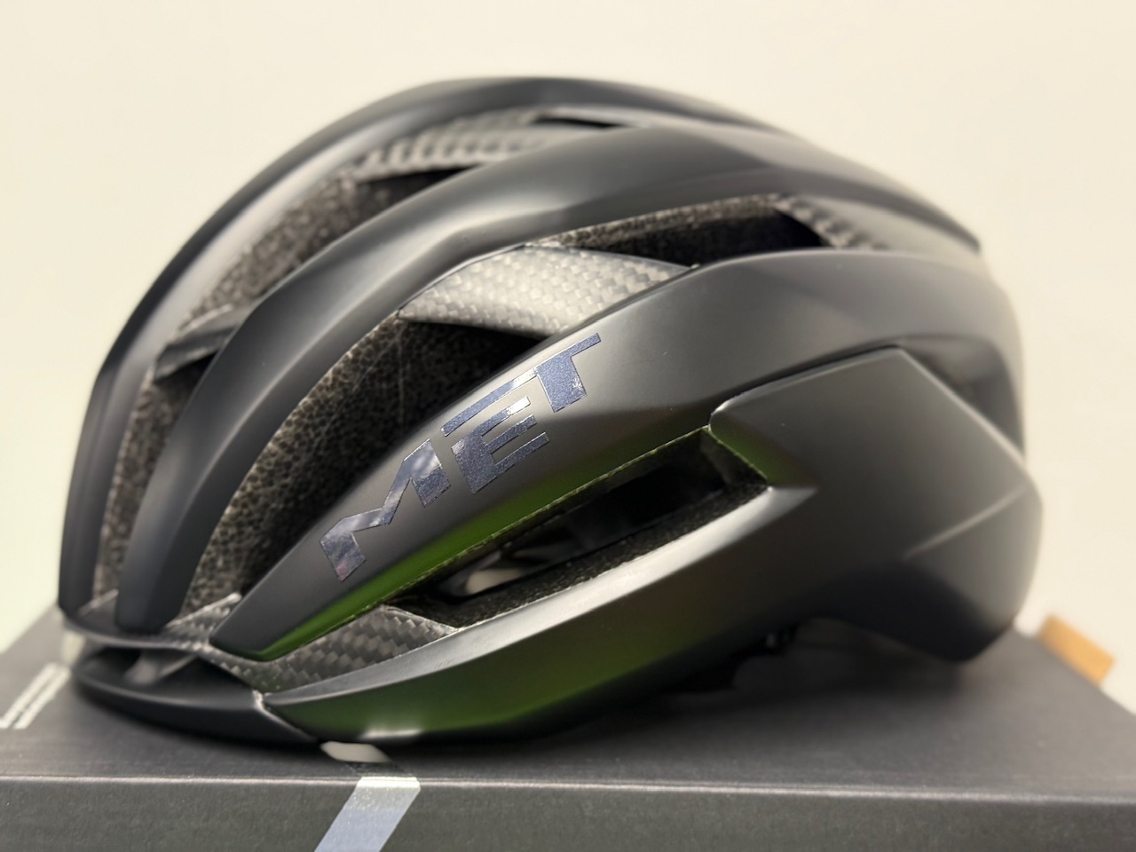 METのフラグシップモデル「TRENTA 3k CARBON」です。世界チャンピオンのタデイ・ポガチャル選手や大活躍の若手イサーク・デル・トロ選手が着用しているモデルです。昨年は2人が勝ちまくっていたので目にする機会が多かったと思います。
