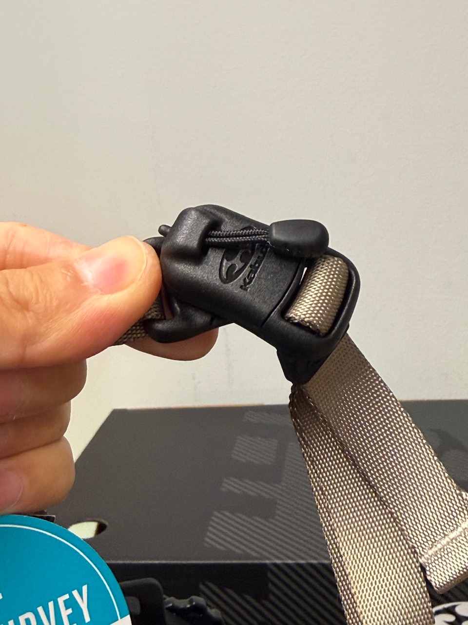 マグネットバックル仕様になっています。真ん中のひもを引くと解除、近づけるとマグネットの力でくっつきます。