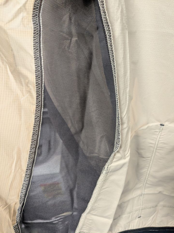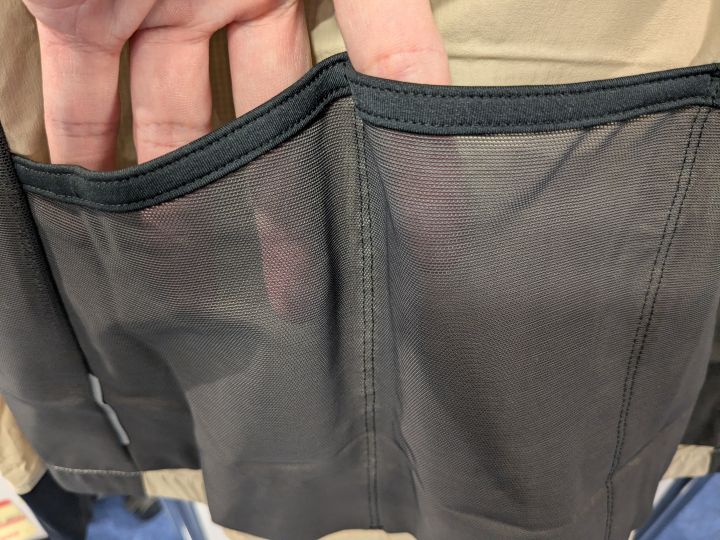風が直接当たらないサイドパネルと腕裏にストレッチメッシュ生地を配し、余分な熱を効果的に逃がす設計。