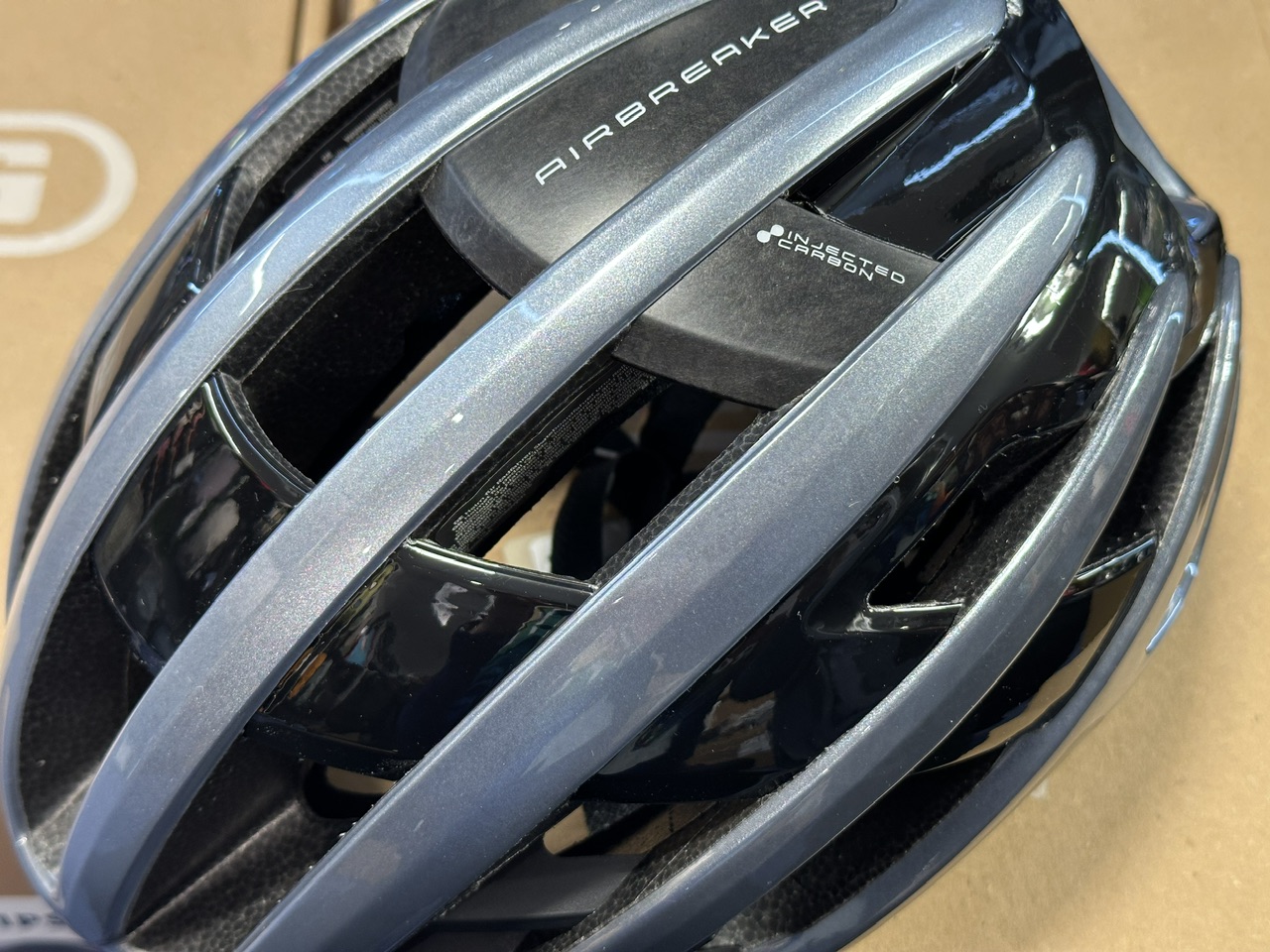 Acti Cageの頭頂部のカーボンブレードの質感と、ヘルメットのグラファイトのカラーがマッチして高級感あふれるカラーとなっております。