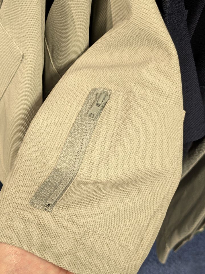右袖にファスナー付きポケットを備えます。IC乗車券などを収納できますが、個人的には普段使いでビジネスホテルのカードキーを入れるのに重宝しています。