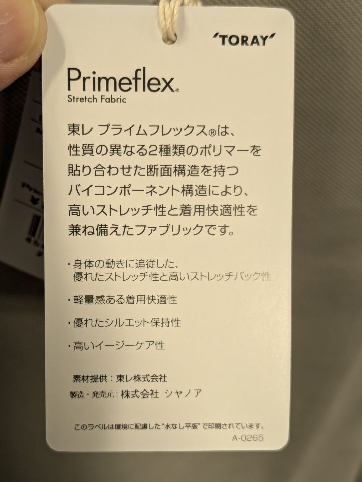 東レのPrimeflex®を採用。型崩れしにくいため旅行先で洗濯もしやすいです。