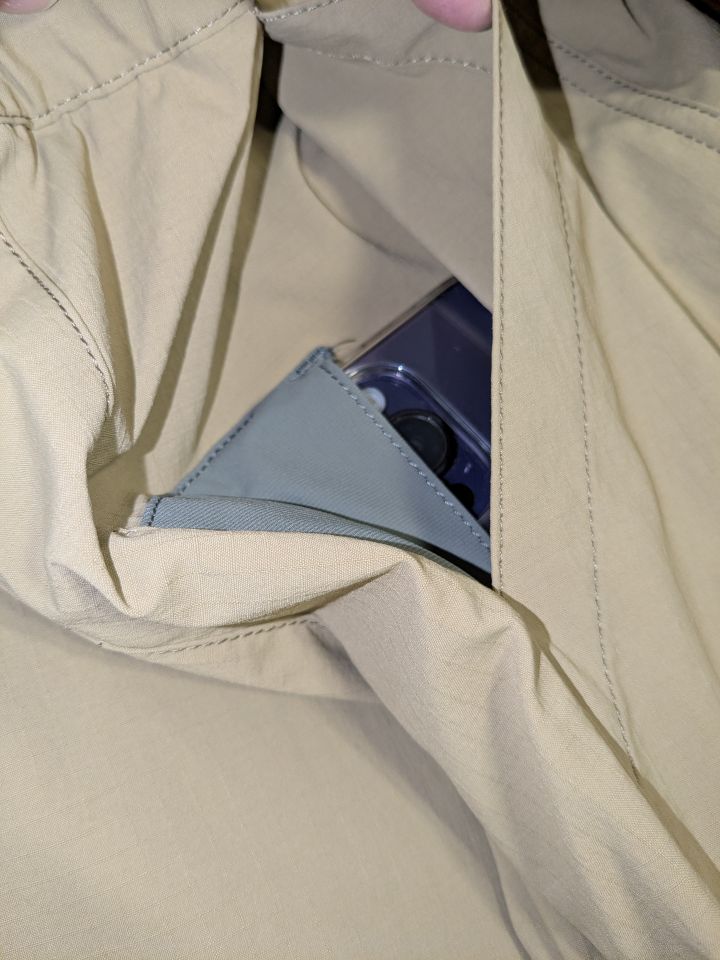 大型ポケットに、スマートフォンなどの脱落を防ぐストッパーを施してある工夫も見事です。