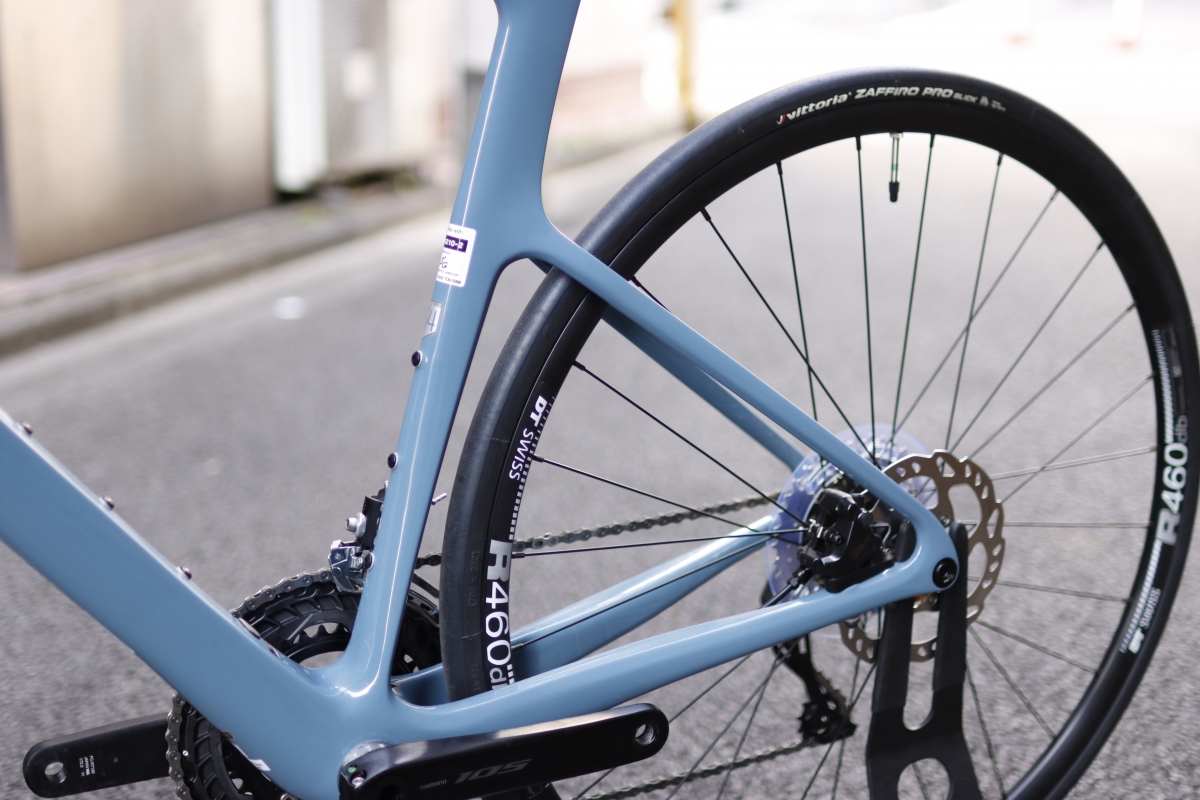 リア三角は小さくまとまってやや細身に作られています。BB~シートチューブ接合部を薄くすることで、路面の振動を吸収しやすくしています。同社のエンデュランスモデルでも採用されています。