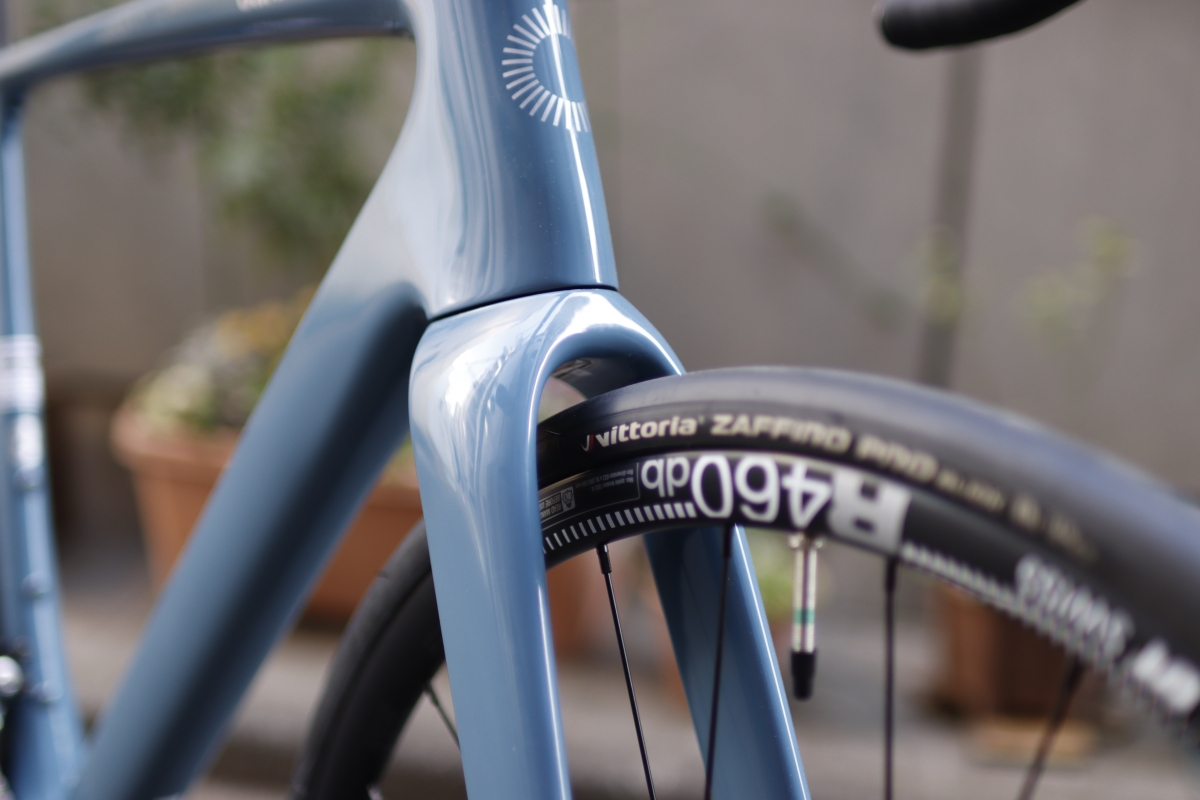 タイヤはヴィットリアの25Cスリックタイプがアッセンブル、少し細身でレーシーな乗り味。