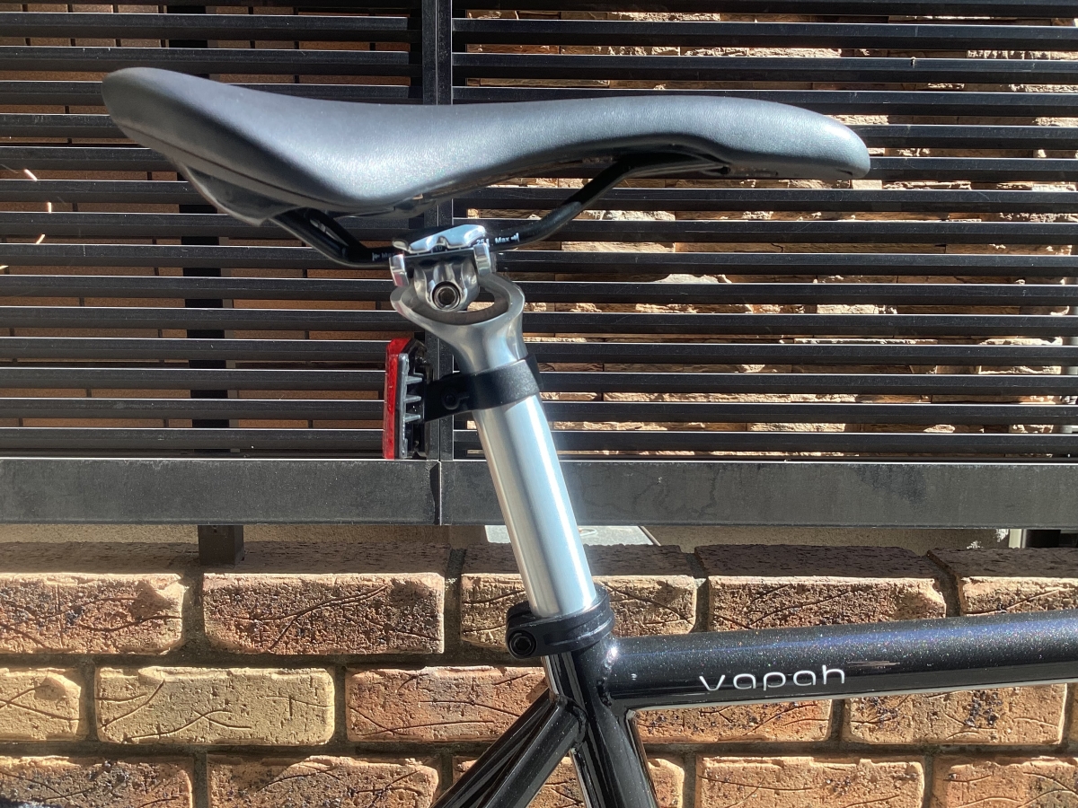 ドロップハンドルにすると握る位置がライザーバーより遠くなるので、オフセットゼロのシートポストで若干前めに座れる様にしてみました。