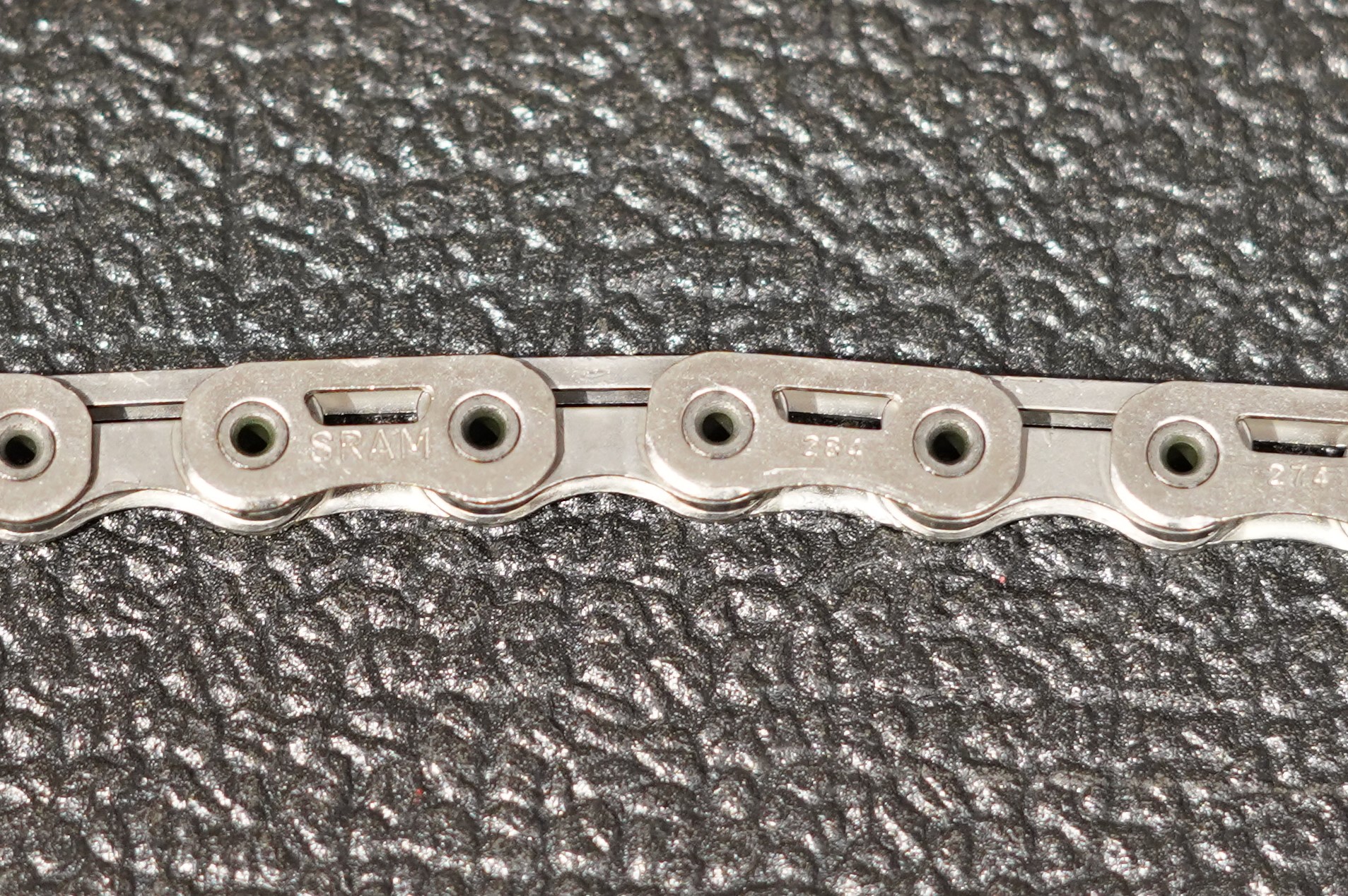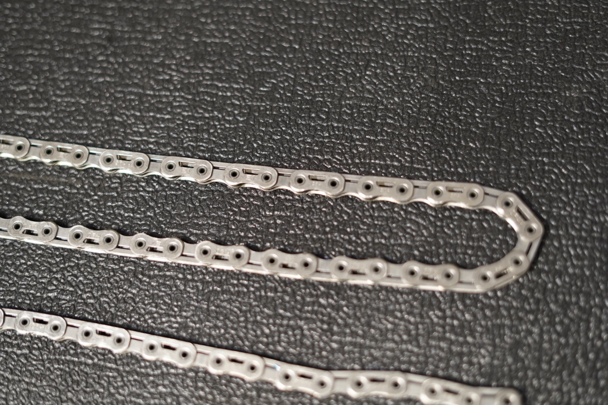 新しくなったフラットトップチェーン。元々の中空ピン仕様に加えて、外/内プレートに肉抜き加工を施すことで更に13gの軽量化。