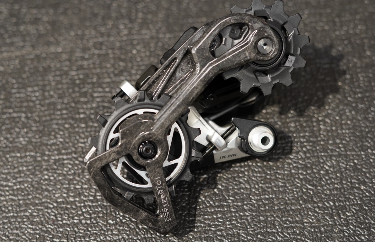 16g軽量化された新型リアディレイラー。以前は対応するスプロケットの違いでShort/Mediumがありましたが、36Tまで対応の1種類に統一されました。ケージリンク部分にシリコンフルードダンパーが内蔵されており、チェーンが暴れるような激しい動きを吸収するため、荒れた路面を走行時でも安定した変速動作となっています。 オフロード分野に強いSRAMらしい機構ですね。