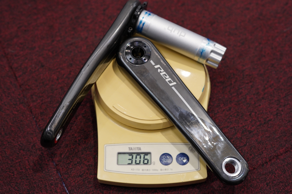 クランク長165mmの実測重量は306gでした。ここまで軽いと剛性は大丈夫なのかと心配になりますが、実際にワールドツアー選手がスプリント時に使用しているわけですから、そこは信頼していいと思います。