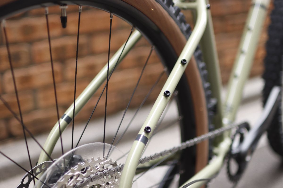 粘りのあるクロモリの特性が感じられそうな細身のリアバック。シートステーはリアエンド付近で下にベンドし低重心かつ安定性のあるジオメトリー。フレームのダボ穴もグラベルバイク並みに豊富に用意されます。