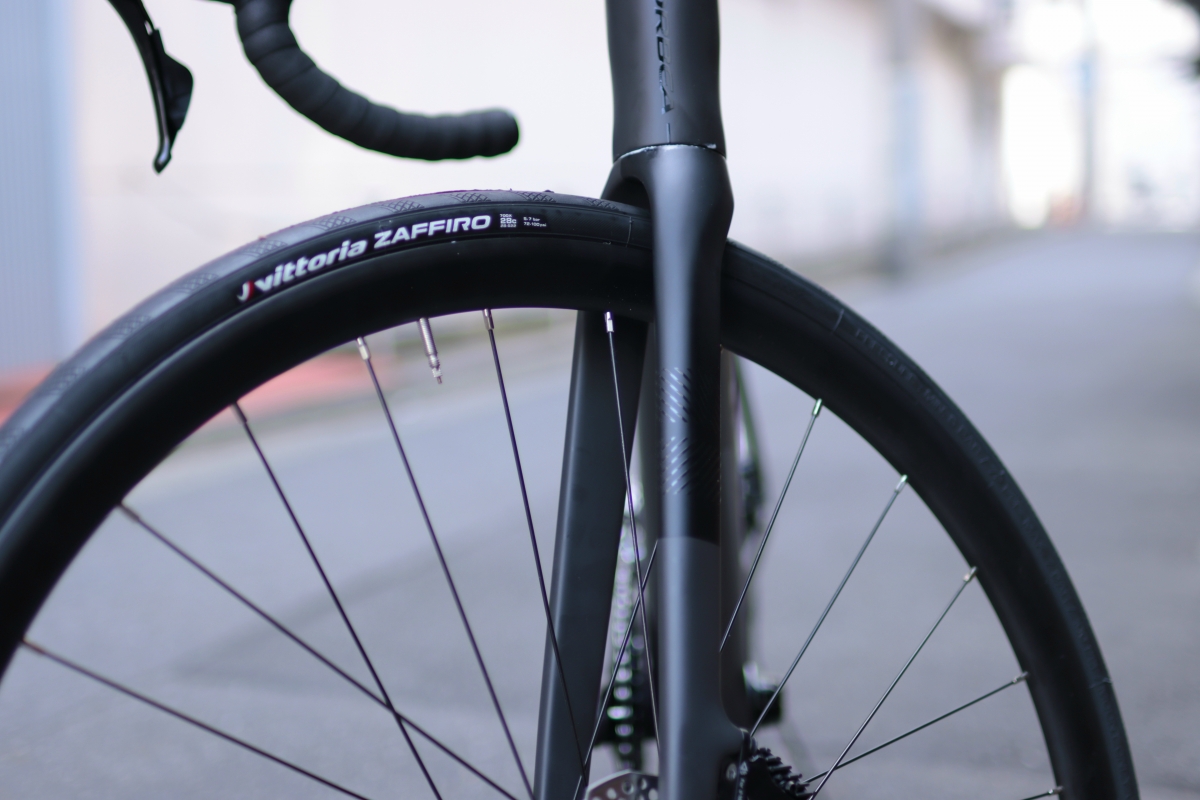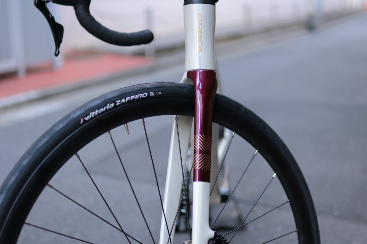 フロントフォークが左右で塗り分けられていて良いアクセントになっています。同価格帯のロードバイクの中でも際立って高級感があり所有欲を満たせます。