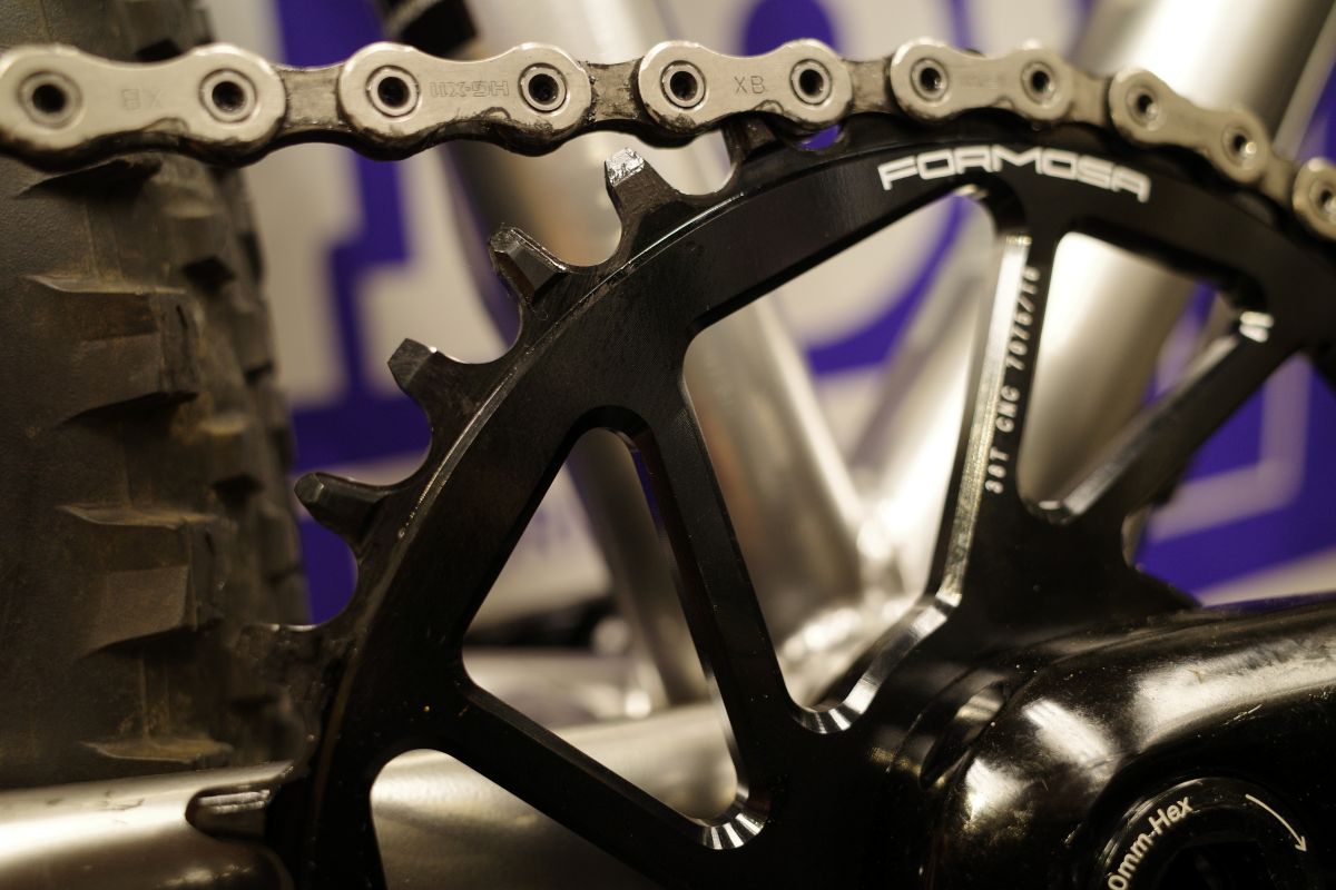 完成車に元からついていたFSAチェーンリングと比べ、歯の先端がよりボリュームのある仕上がりになっており、フロントシングルでおこりやすいチェーントラブルを軽減してくれそうです。実際に乗ってみると、路面から衝撃が来た際にFSAで起きていたチェーンがズレる感覚、わずかに感じる異音違和感が無くなり、チェーンがスムーズかつしっかりリングに噛みあい、クランクそのものの剛性とも相まって推進力が上がったような感覚があります。耐久性ももちろん気になりますが、チェーンリングは消耗品なので、ゴリゴリ使ってこまめに交換、という方が良いと思います。その点でもフォルモサはリーズナブルで使いやすく、歯数やカラーのバリエーションも豊富ですので、MTB系のチェーンリングを探している方にはお薦めしたいパーツです。