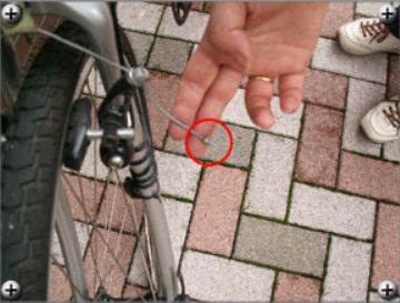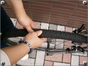 一番シンプルなのは「フロントホイールを足で挟んでハンドルを左右にこじってみる」ですね。