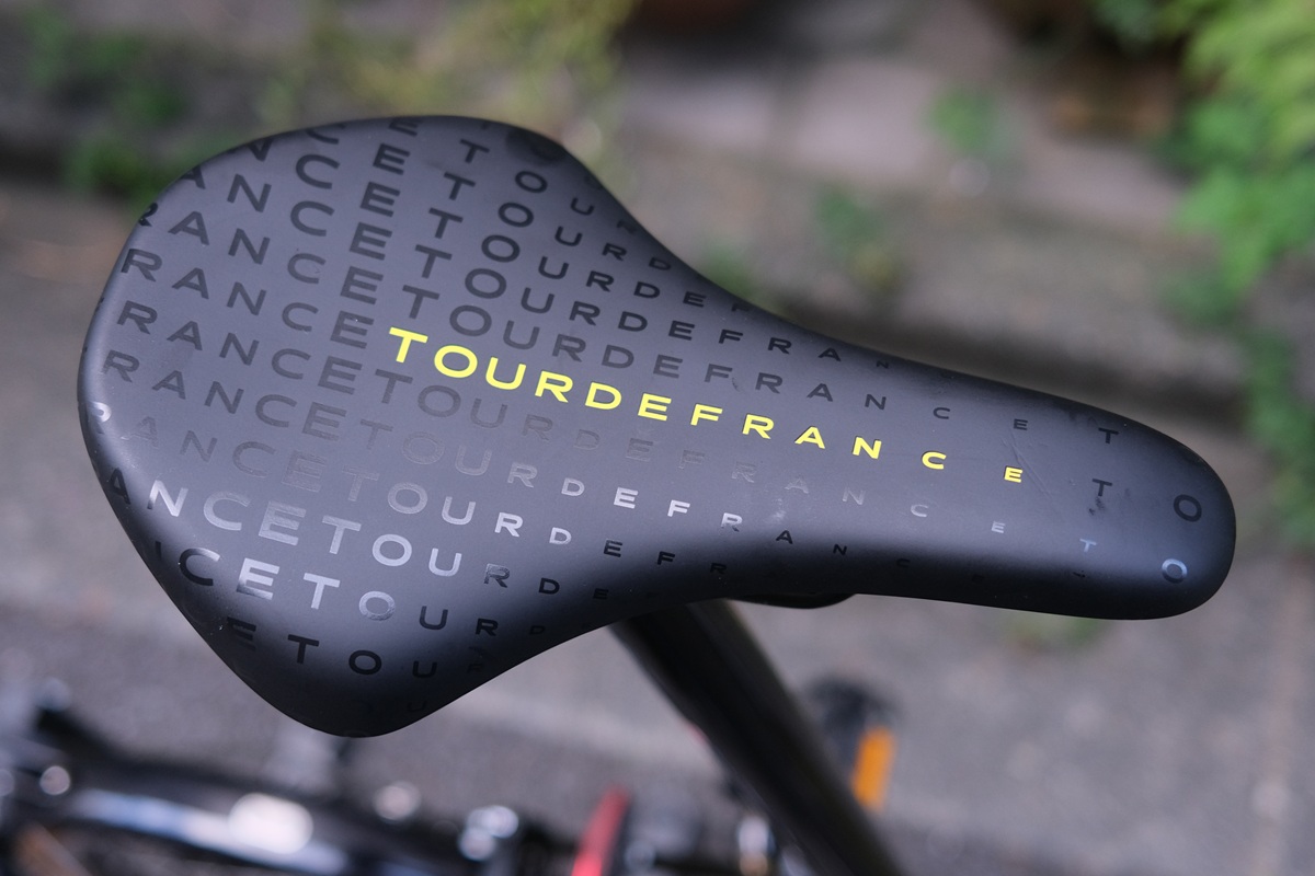ほどよいイエローの差し色がお洒落なサドル(ロードバイク用としてあっても良さそうなデザイン!)