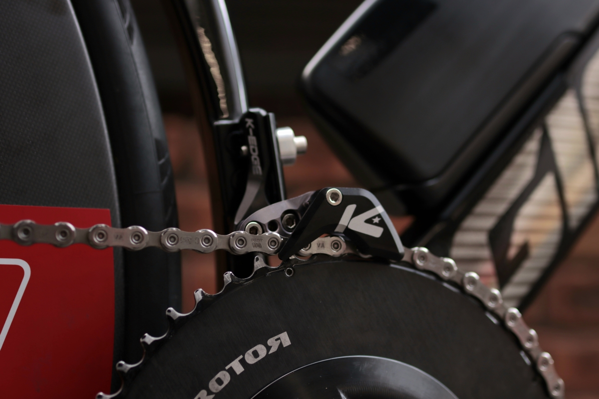 フロントシングルはディレイラーが無いためチェーン落ちのリスクがあるのでK-EDGEのチェーンキャッチャーを付けています。