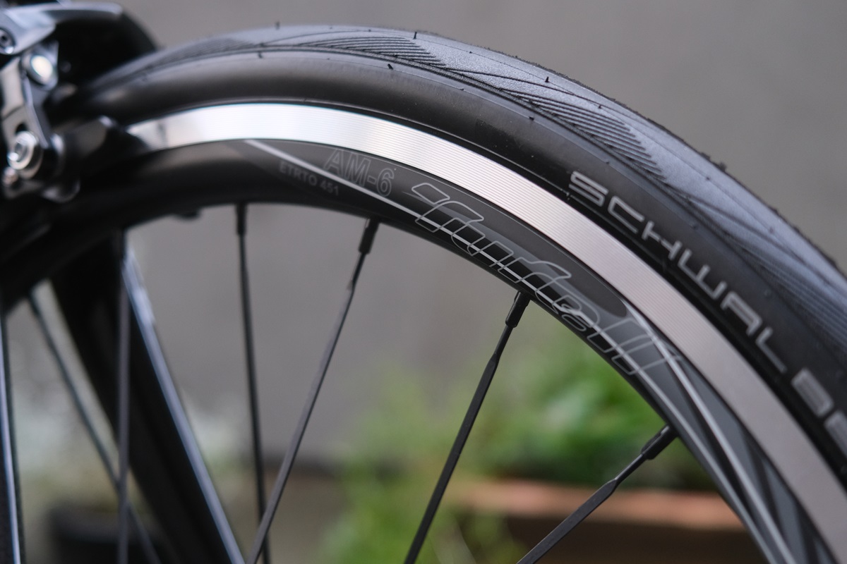 回転性能に定評があるTyrellのハブに、ワイドリムを組み合わせた高性能20インチホイール AM-6(22インチに迫るETRTO:451サイズ)を装備。ワイドリムは、低めの空気圧でも転がり抵抗の軽さとコーナーでの踏ん張り感を得られます。