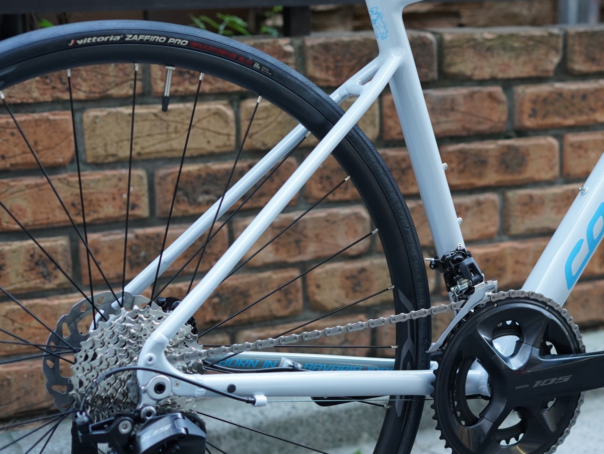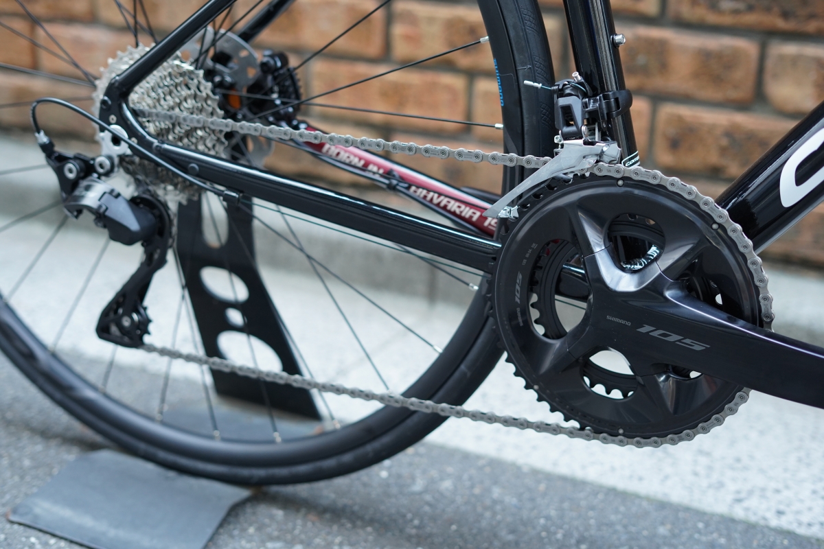 クランクまできちんと最新の105コンポーネントを採用しています。変速性能・操作感の良さが際立ちます。