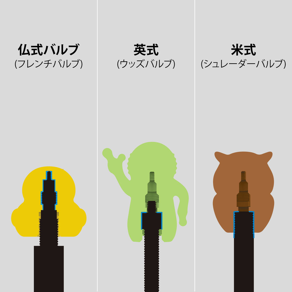 仏式/英式/米式バルブに対応。シティサイクルの自転車はもちろん、バイクや車のタイヤにも装着することが可能です。