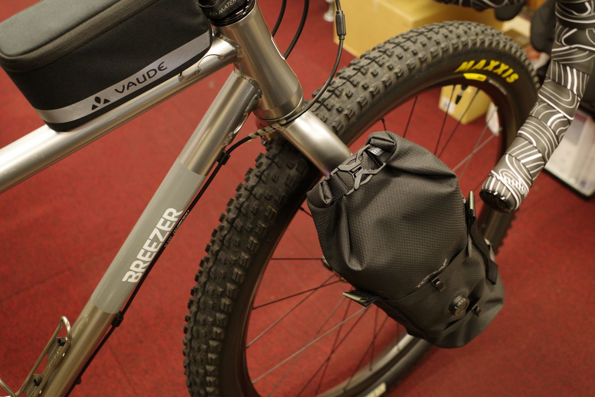 こちらはバイクベース装備のMTBに付け、通勤シャツ2枚と身の回りの物を格納した状態。狭いフレーム内ですが普通に収まっています。