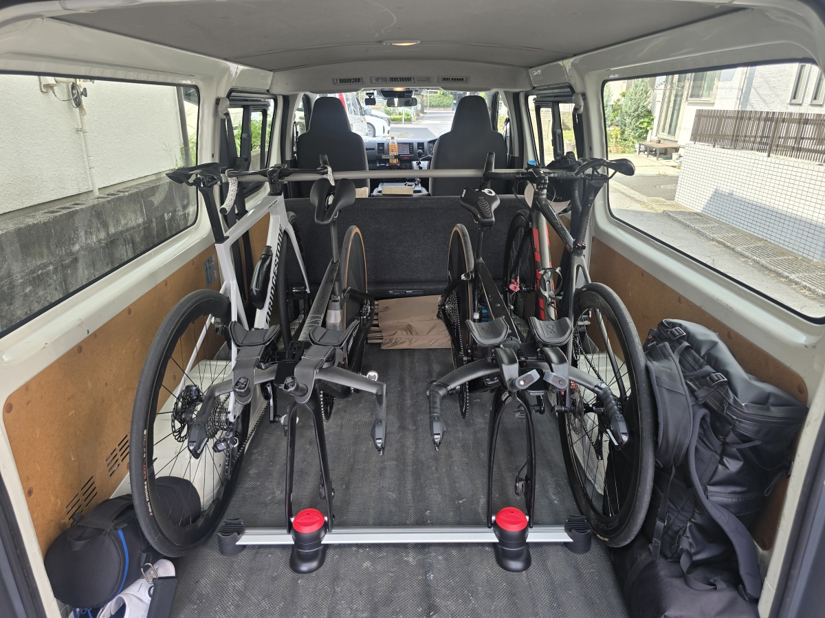 ロード2台は仕切り棒にSTIレバーを引っ掛けて、TTバイク2台はミノウラのVERGOにマウント。空いた隙間に各々の荷物をクッション材替わりに突っ込んでいけば、