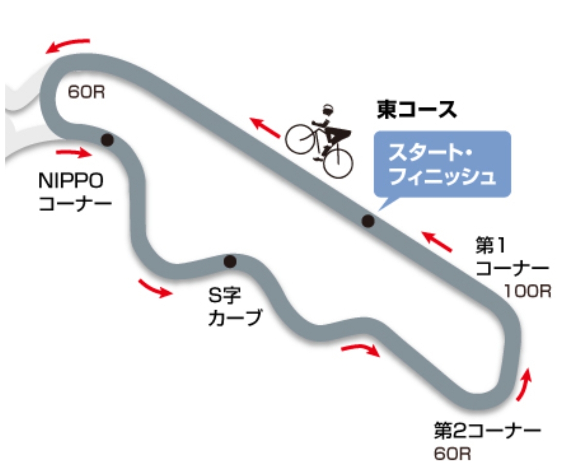 コースプロファイルは、スタートからゆる登りが始まり、1発目の左コーナー手前で少し斜度が上がります。登り切ってNIPPOコーナーから爆速の下りS字カーブが迫ってきます。全開で下ったら第2~第1コーナーを回って登りホームストレート。のような流れです。