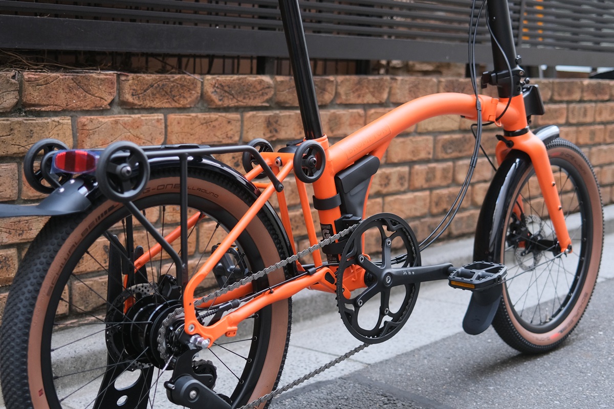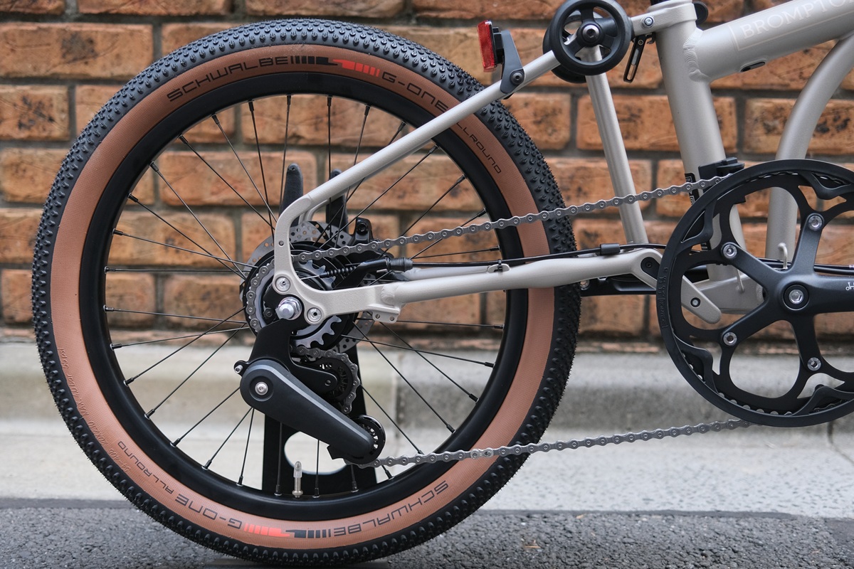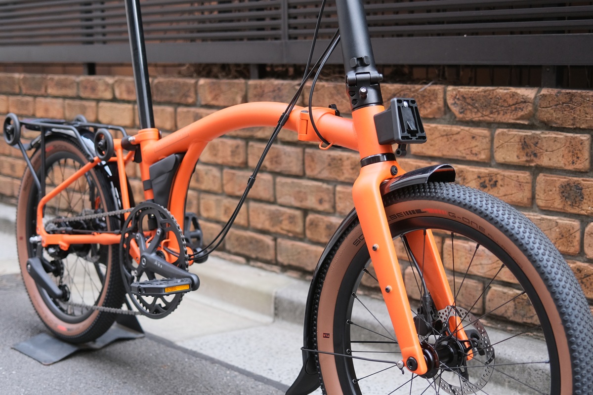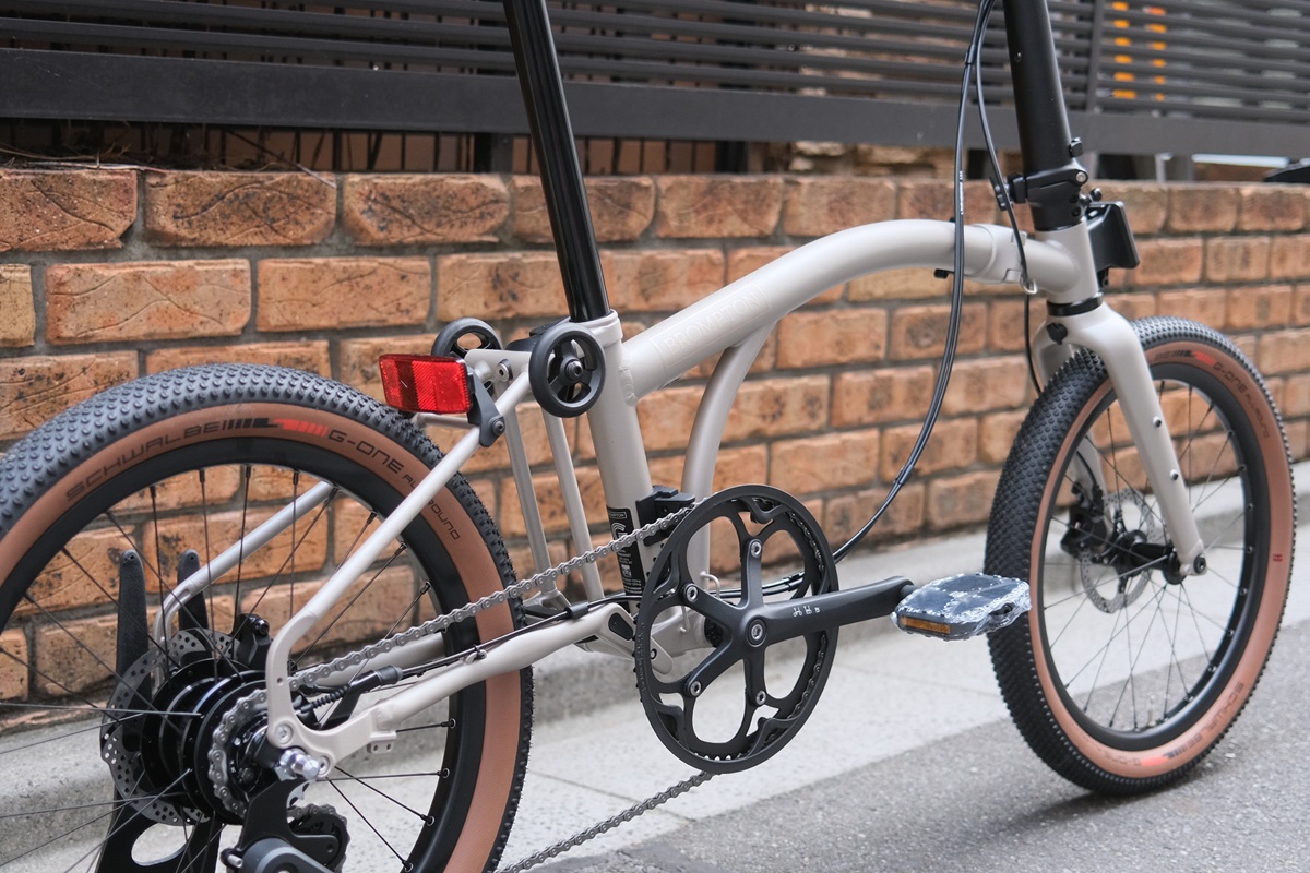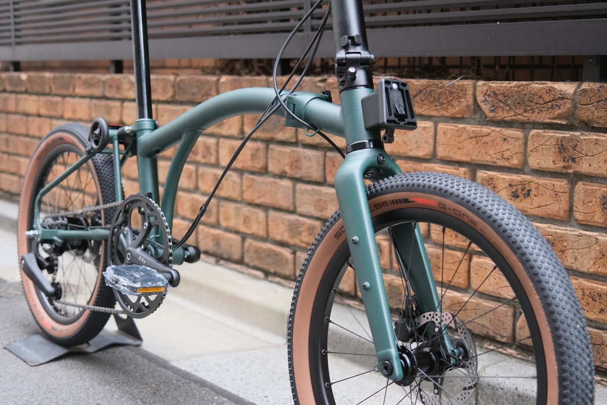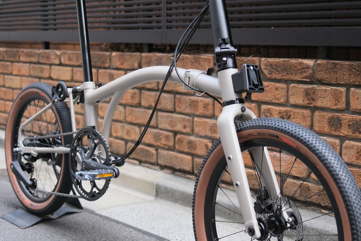 16インチ(ETRTO35-349) → 20インチ(ETRTO54-406)へと変更。インチアップし、タイヤ幅も20mm近く太くなりました。これによって走行安定性や快適性が向上すると共に、グラベルや石畳などの荒れた道もこなせるようになりました。更に、特注の耐パンクタイヤがセットされ、トラブル防止にも配慮。Tubeless readyとなっており、拡張性も持たせています。