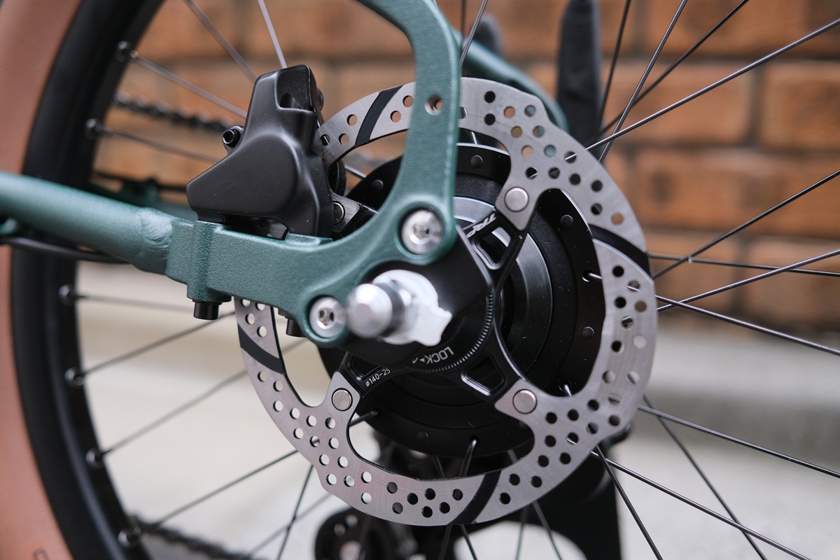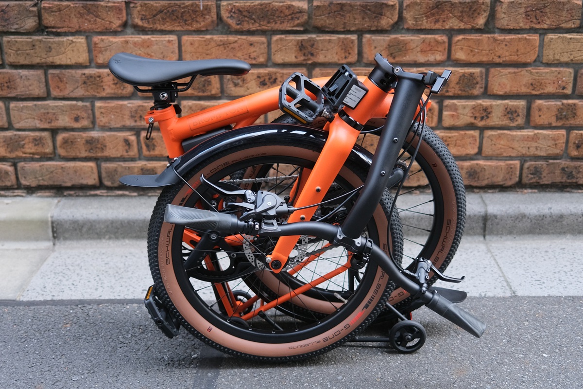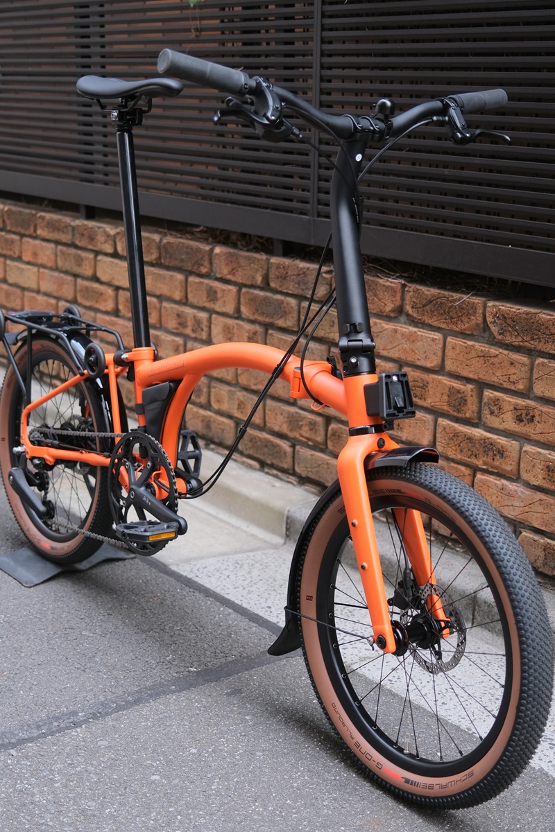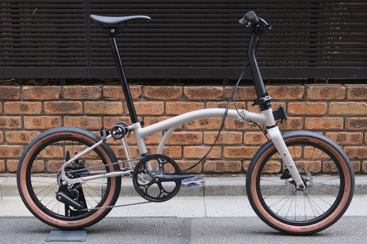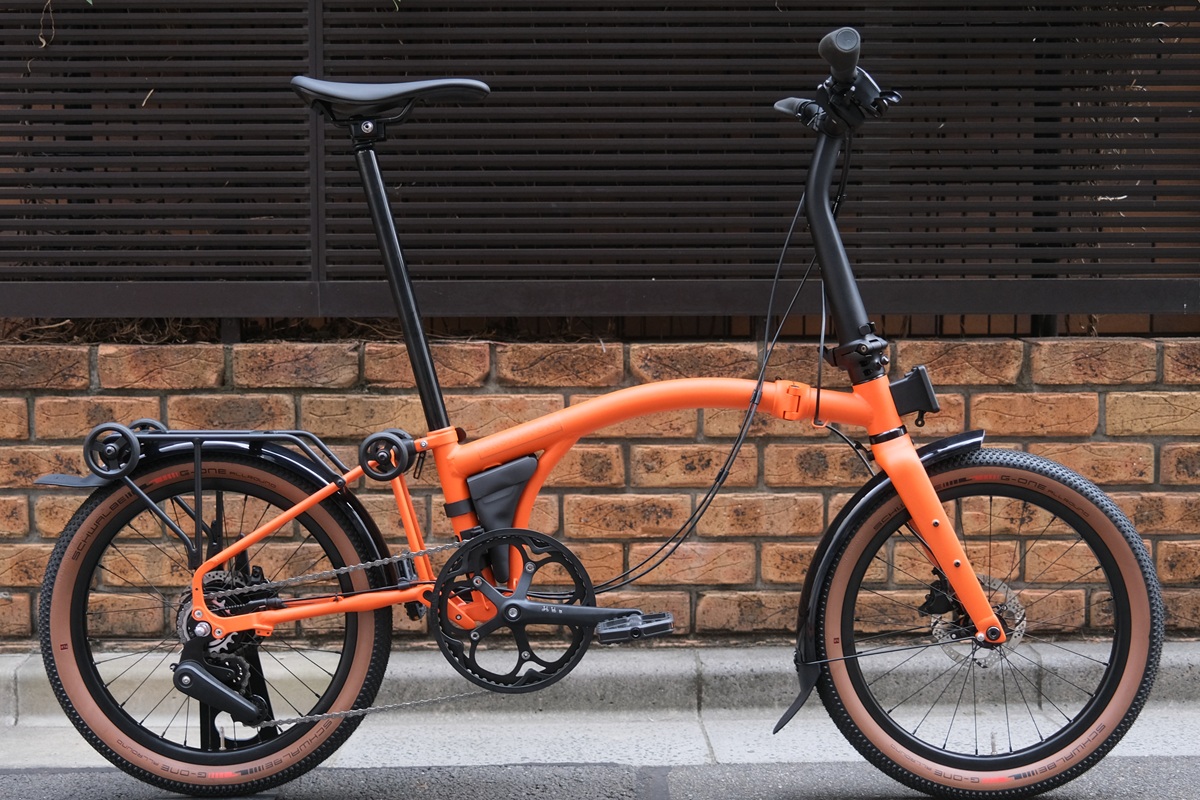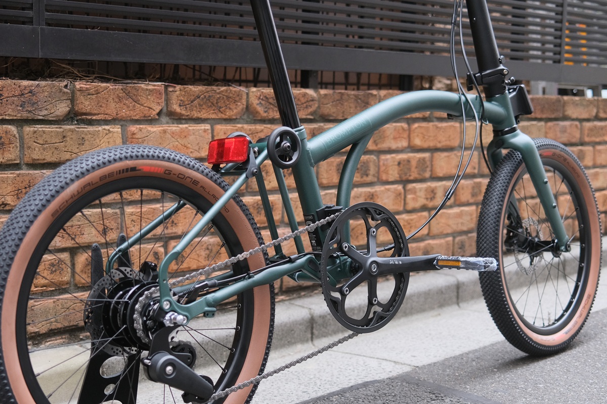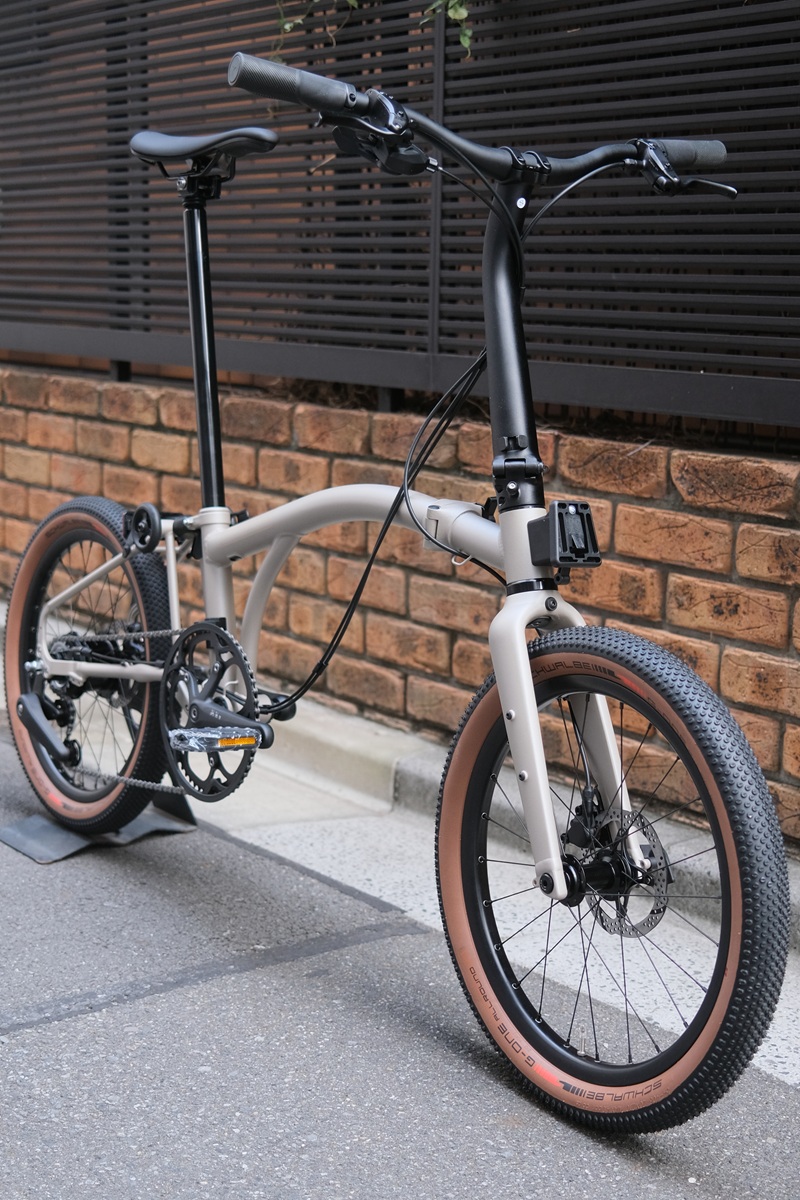 16インチ(ETRTO35-349) → 20インチ(ETRTO54-406)へと変更。インチアップし、タイヤ幅も20mm近く太くなりました。これによって走行安定性や快適性が向上すると共に、グラベルや石畳などの荒れた道もこなせるようになりました。更に、特注の耐パンクタイヤがセットされ、トラブル防止にも配慮。Tubeless readyとなっており、拡張性も持たせています。
