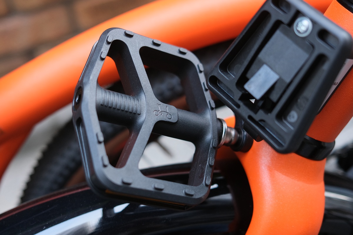 左ペダルは脱着式、折り畳み時はフロントフォーク後ろにホールドすることが出来ます。