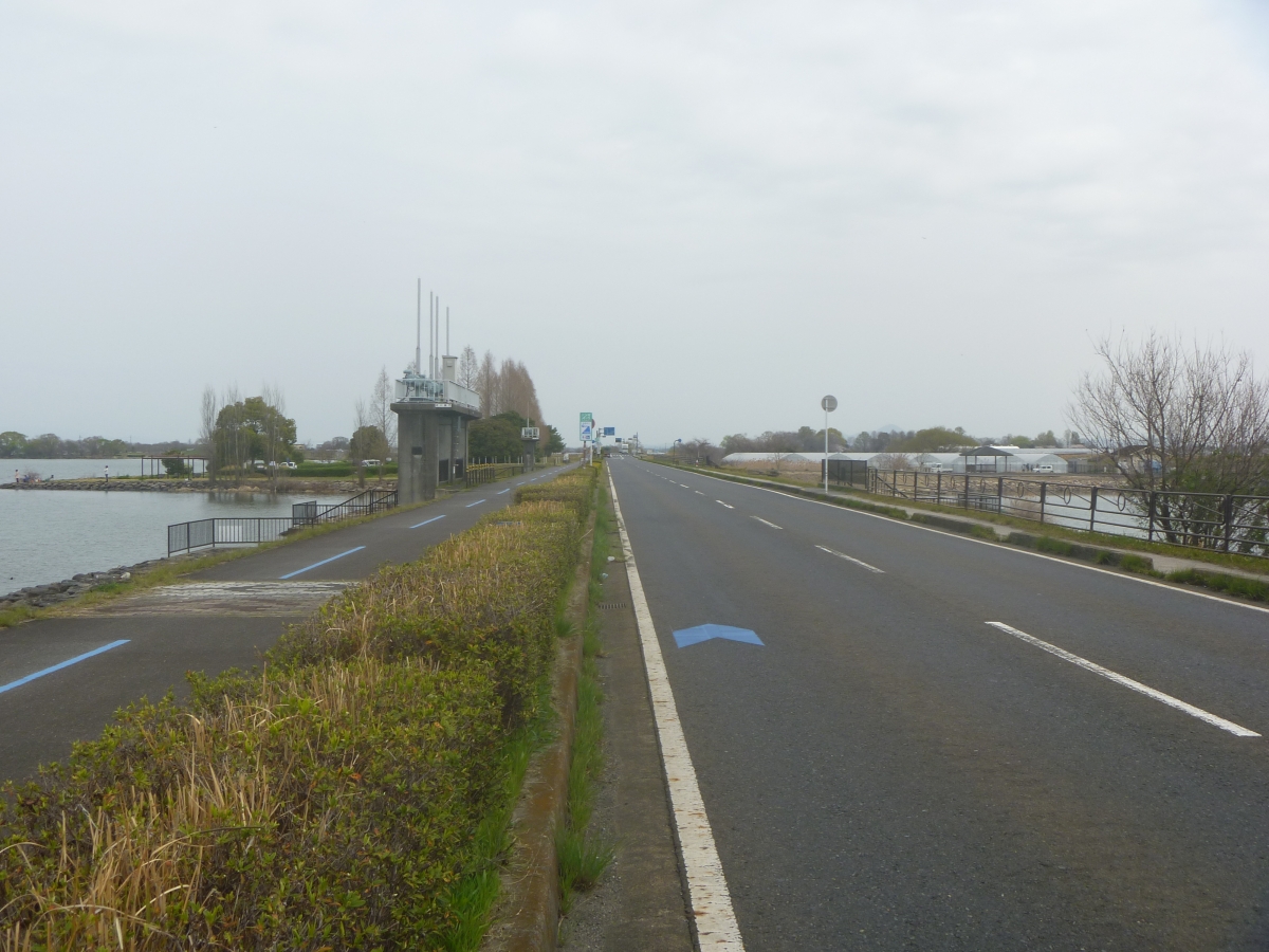 延々と伸びる平らな道と左手の琵琶湖。