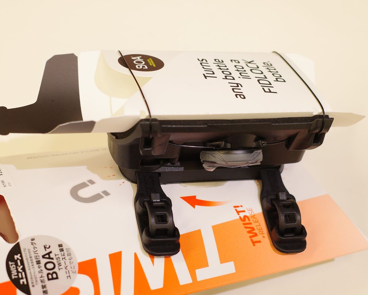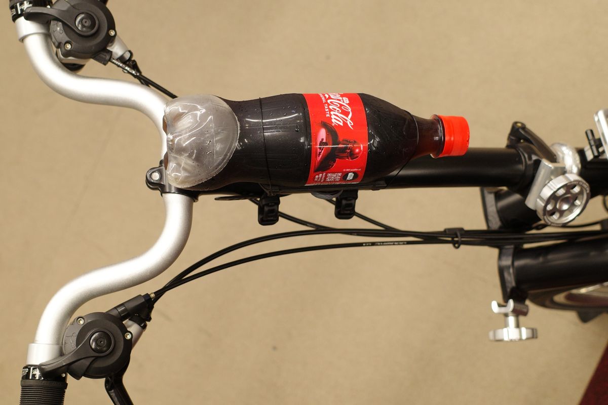 冷えたコーラも試してみます。細い方を下にすると安定しました。FIDLOCKの落ちづらさ、衝撃への強さは過去に付けたアイテムで体験済ですが、走行の振動を考えるとやめたほうがいい組み合わせです。