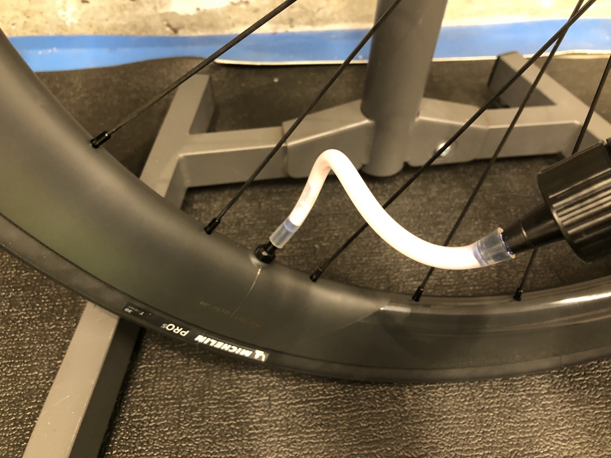 いつものようにMUC-OFFシーラントを注入。タイヤインサートはシーラントを吸わない素材になっているそうですが、念のためちょっと多めの100ml程入れておきました。