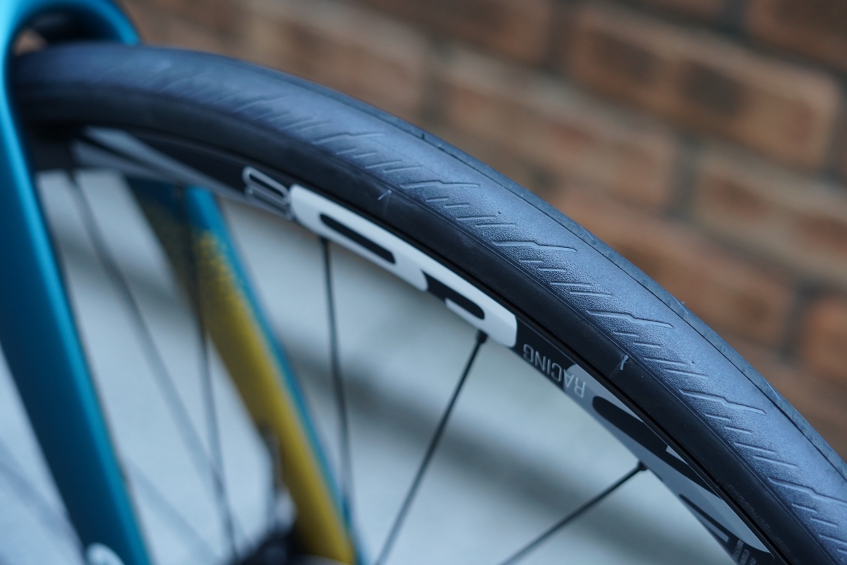 ホイールはアルミですが、完成車品としてはややグレードの高い「RACING 600 DB」を採用。重量1800g程度なので、そのままでもなかなか軽快に転がります。タイヤはPIRELLI P7の28Cを装備しています。