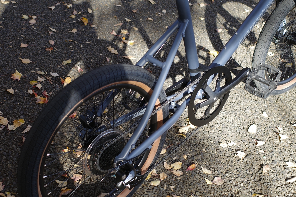 20インチ X 2.30のMTB並みの太いタイヤを装備!抜群のエアボリュームで安定感がありつつ、ブロックパターンの無い転がりの良いデザインで、漕いだ瞬間スッといい感じに加速してくれます!良い意味で見た目を裏切るスポーティーな走りと、見た目通りのショック吸収の良さもあり新鮮な感触です。