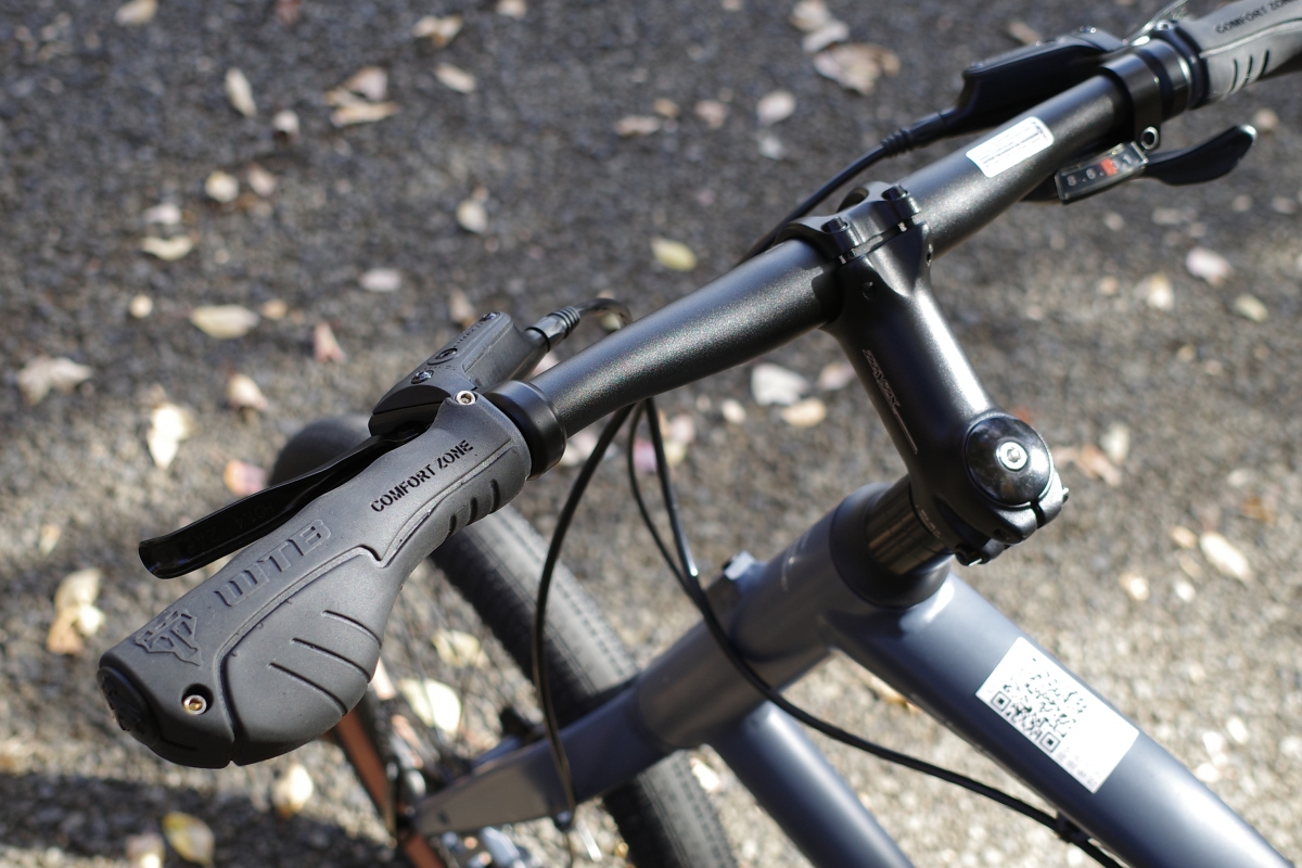 ブレーキはTEKTROの油圧ディスクブレーキ。 太いタイヤのグリップ力を活かせるスムースなタッチと制動力のブレーキで価格を考えると非常に良心的なパーツ構成になっています! エルゴミックな形状で手に優しい、WTBのコンフォートゾーングリップも個人的にポイント高く、気軽に使える、とスポーツ性のバランスが良いなと!