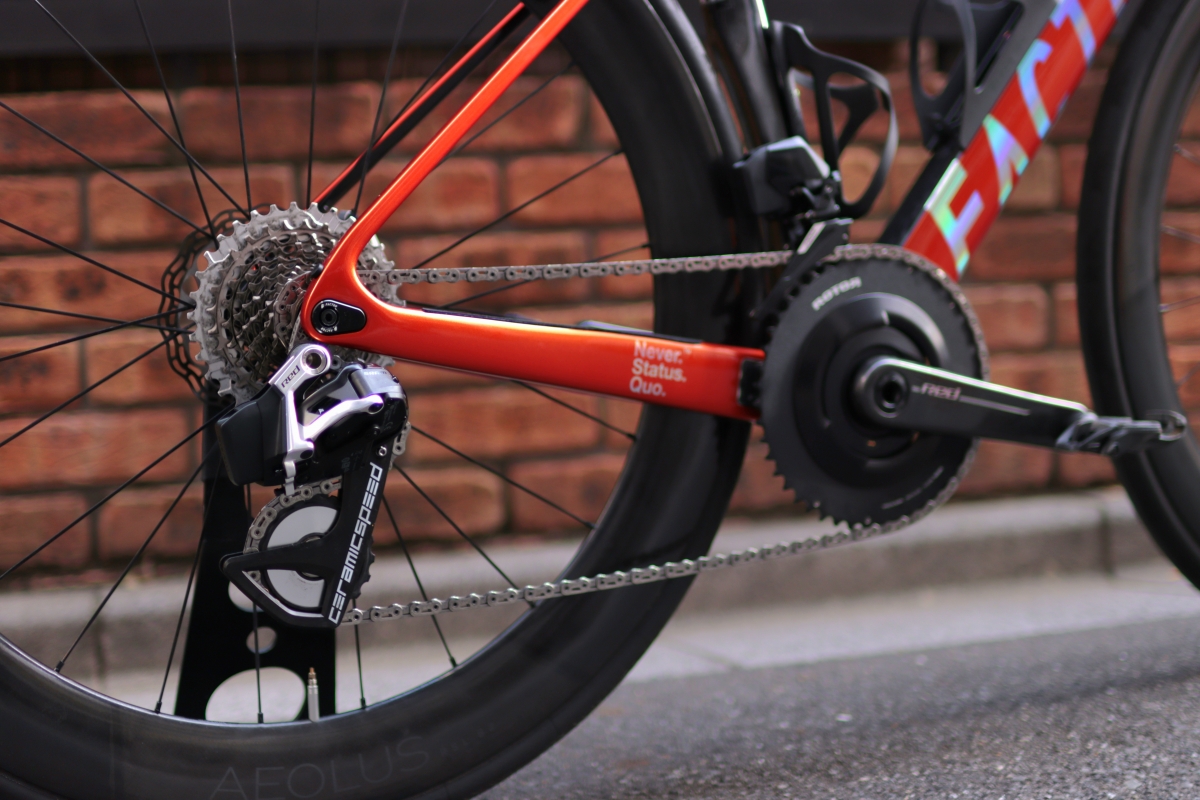 究極の駆動抵抗を実現するため、プーリーをCeramic Speed OSPWに換装。シルバーカラーがSRAMのディレイラーにピッタリ。