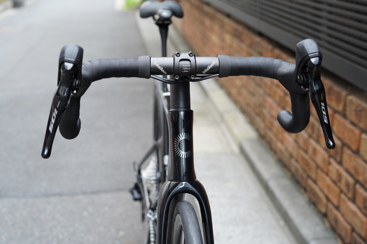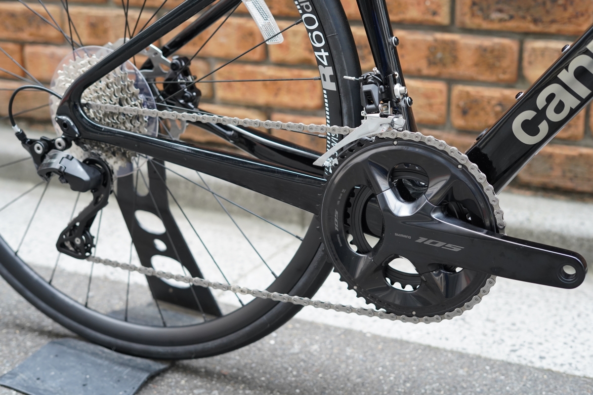 機械式変速のシマノ105を搭載。12段変速による細やかでワイドなギアリング、そして油圧ディスクブレーキによる高いブレーキ性能が特徴。